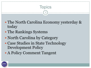 The presentation discusses the evolution of North Carolina's economy, highlighting the shift from traditional industries like textiles and tobacco to technology, pharmaceuticals, and automotive sectors by 2007. It compares the state's performance in various technology and innovation rankings, situating North Carolina at various points in 2010 among other states, while emphasizing the importance of both small and large businesses in fostering job growth and innovation. The document also explores future opportunities in tourism, aerospace, and green industries for further economic development.