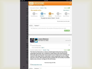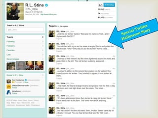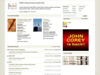 Dr. Karin Perry presented at NCTE 2012 on using social media in libraries and classrooms. She discussed using Facebook pages and groups to share book reviews and announcements. QR codes and booktrailers on YouTube were suggested to promote books. Twitter was described as useful for backchannel discussions using class hashtags. Library-focused social networks like LibraryThing and Goodreads were also presented.
