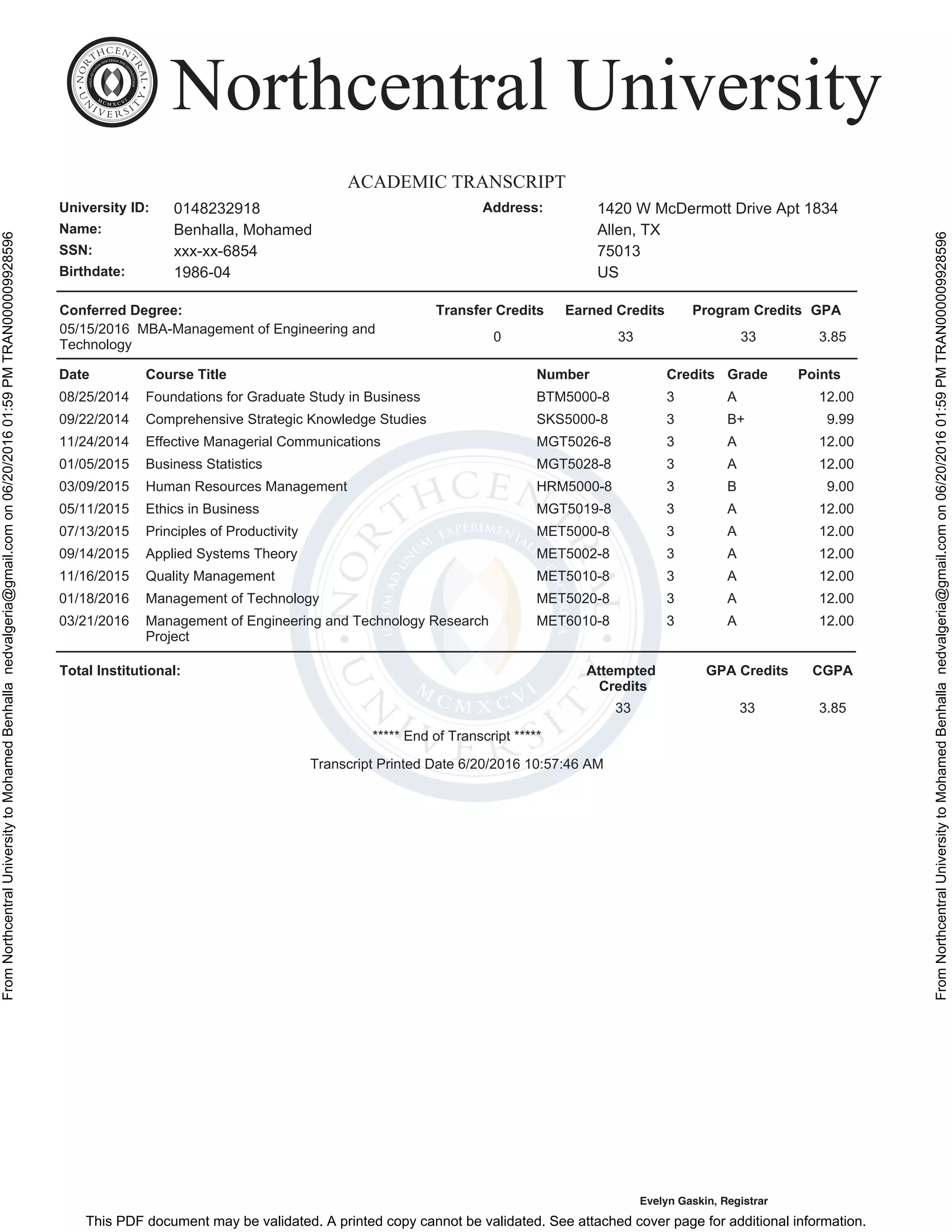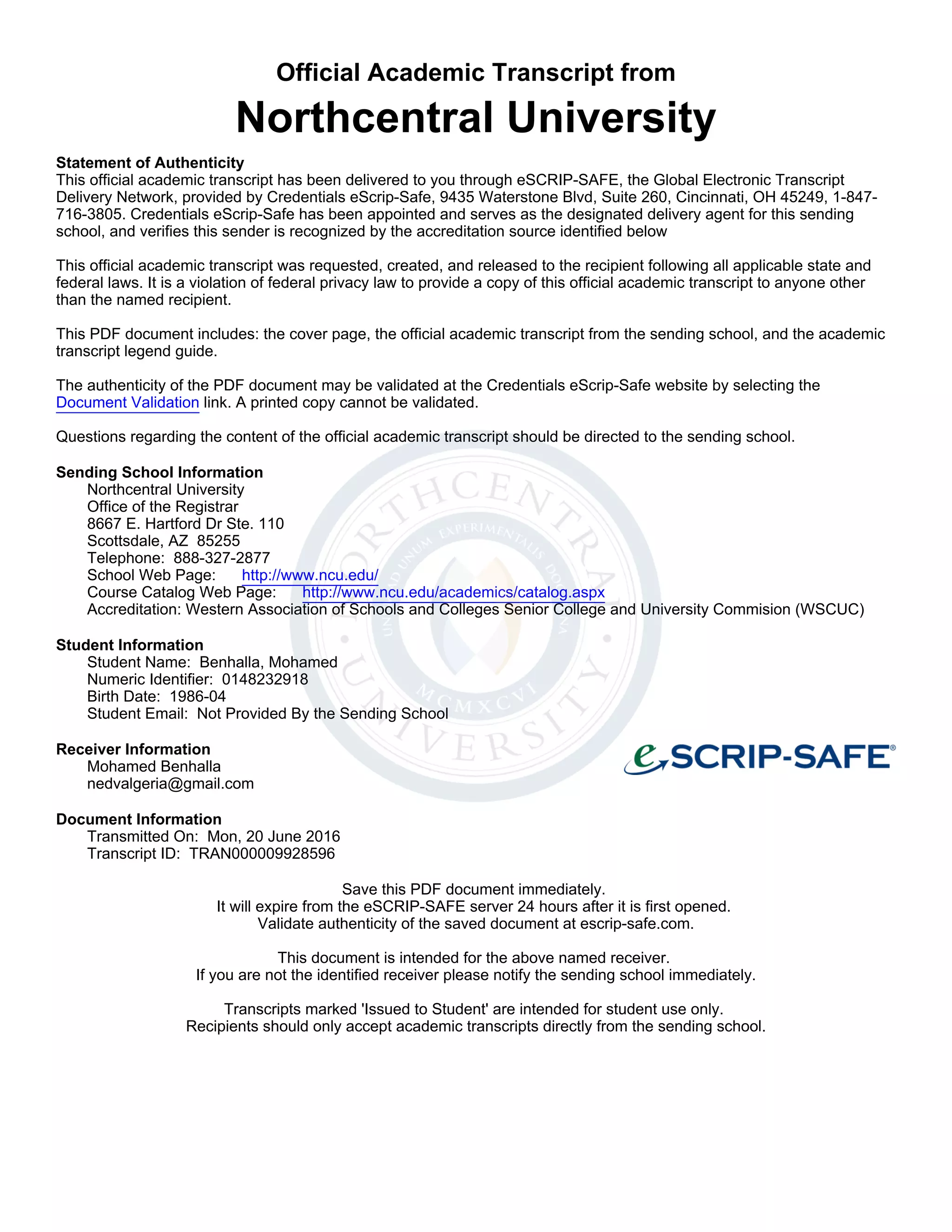 This official academic transcript from Northcentral University documents that Mohamed Benhalla earned a Master of Business Administration in Management of Engineering and Technology. He completed 33 credit hours with a cumulative GPA of 3.85. The transcript lists the courses taken, grades received, and conferred degree. It can be validated on the Credentials eScrip-Safe website to confirm its authenticity.