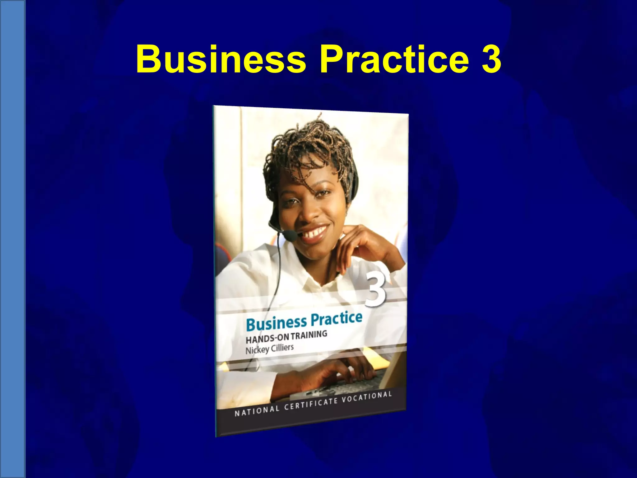The document outlines Module 3 of a business practice course focused on the business environment in South Africa. It covers types of organizations, including government, non-profit, and business organizations, their roles, and market concepts such as marketing principles and market positioning. Additionally, it explores stakeholder relationships, business activities, and the implications of various sectors and their contributions to the economy.