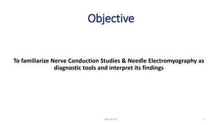 This document provides an overview of electromyography (EMG) and nerve conduction velocity (NCV) studies as diagnostic tools for neuromuscular diseases. It covers the objectives, types of tests, instrumentation, procedures, clinical interpretations, and limitations associated with EMG and NCV. The findings from these studies are essential for developing appropriate physiotherapy interventions based on the severity and type of neuromusculoskeletal injuries.