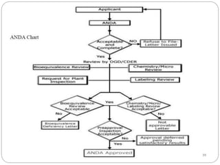 This document provides an overview of regulatory affairs processes for new drugs, including Investigational New Drug (IND) applications, New Drug Applications (NDA), and Abbreviated New Drug Applications (ANDA). It defines these terms and describes the required contents, format, review process and differences between IND, NDA, and ANDA submissions to regulatory agencies like the FDA. Key points covered include the types of clinical trials and data required for each application and how generic drugs can demonstrate bioequivalence rather than conducting new clinical trials in an ANDA.