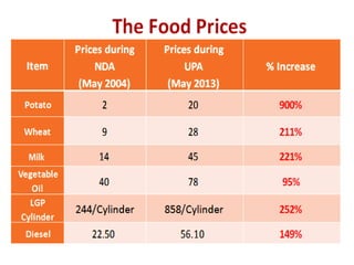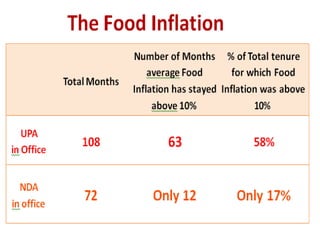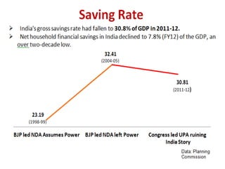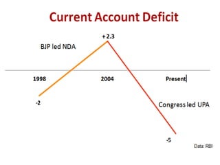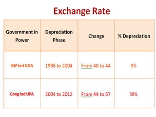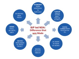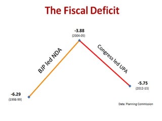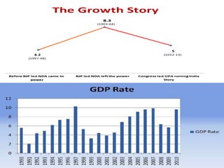 The document summarizes key economic policies and indicators during the BJP-led NDA government from 1999-2004. It discusses policies like economic liberalization, privatization of state corporations, establishment of special economic zones, and expansion of foreign investment. It also outlines various economic indicators like GDP growth, inflation, fiscal deficit, current account deficit, forex reserves, and unemployment rate during this period.