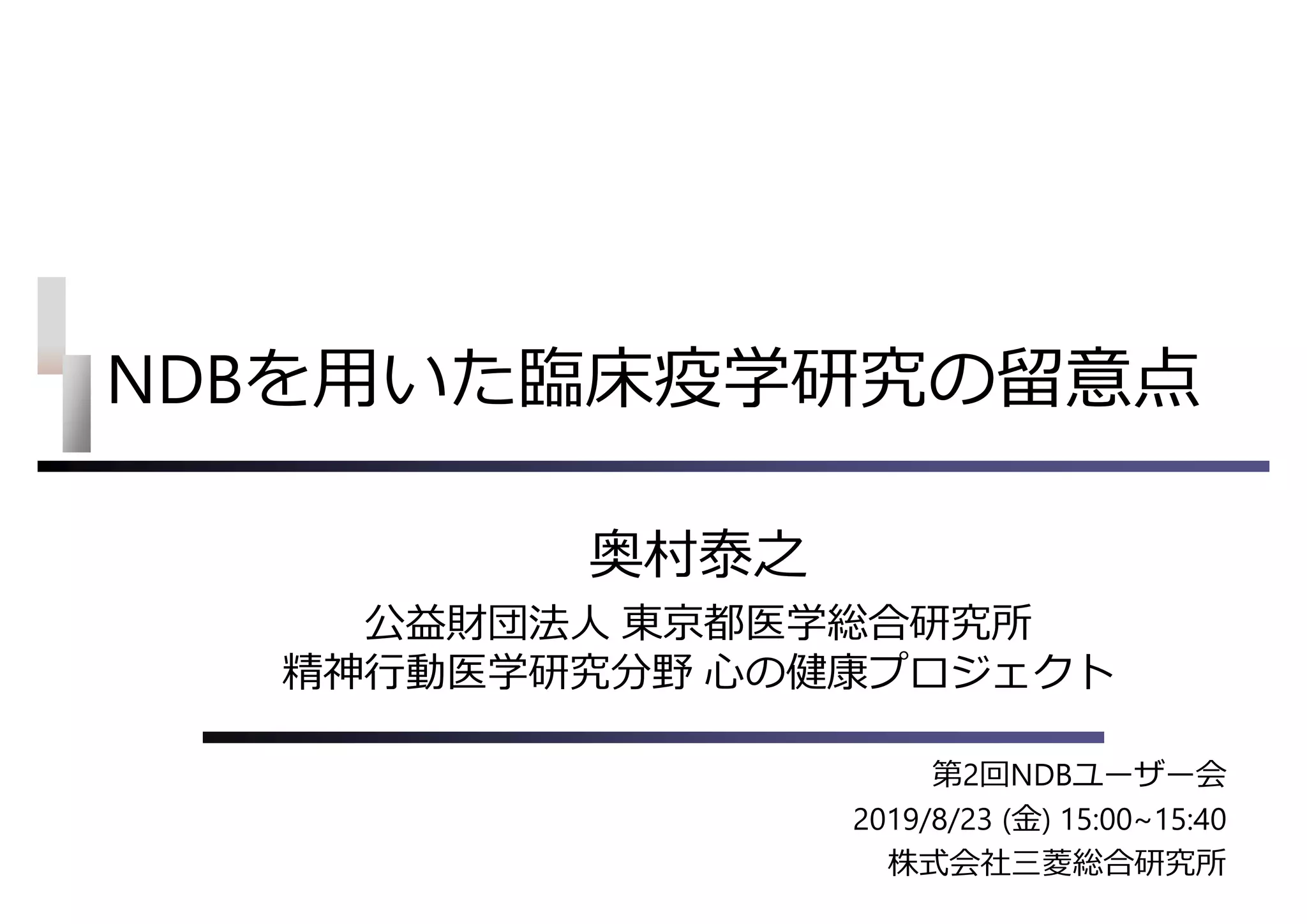 NDBを用いた臨床疫学研究の留意点 1. 2. 3. • 厚生労働省は,新たに入院する精神障害者は,原則 1 年未満で退院する体制を確保するべきとしている。