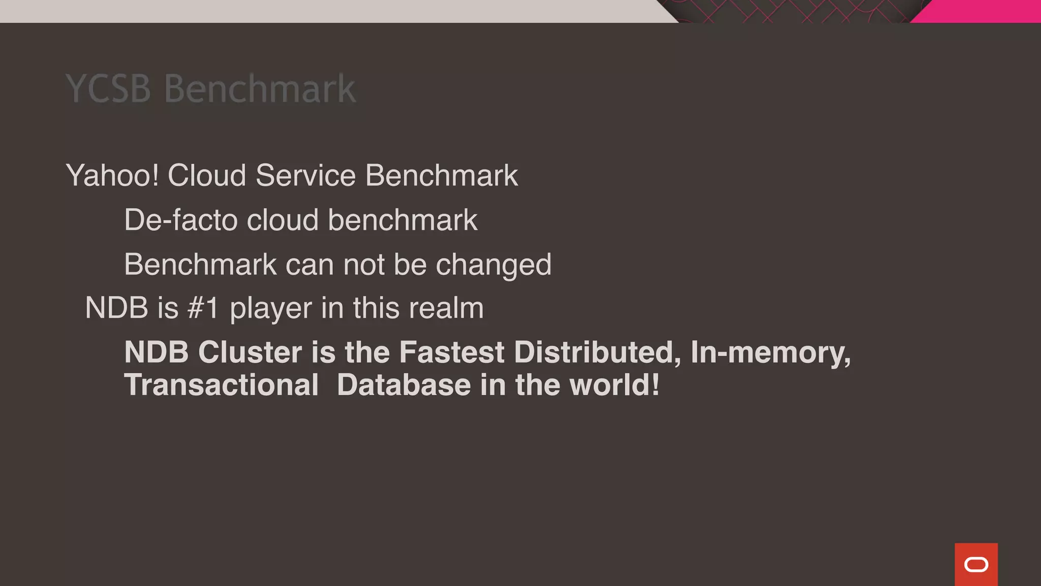 NDB Cluster 8.0 was benchmarked using YCSB, the de facto cloud benchmark. The benchmark showed that: