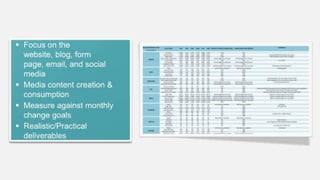 The document proposes a content strategy plan for the Neighborhood Design Center's website. It identifies key target personas as volunteers and donors. It outlines the buyer's journey for each persona and how they become aware of, evaluate, and purchase the organization. The content voice is described as curious, innovative, and optimistic. Key themes and messages focus on the organization's legacy, impact, partnerships, and innovative design ideas. Unique differentiators include the operating model, civic component, and community roots. A six-month content production and distribution plan is proposed to guide staff, underscore messages, allocate resources, capture metrics, and maximize digital channels. An editorial calendar, process, and distribution plan are recommended along with a content audit and measurement