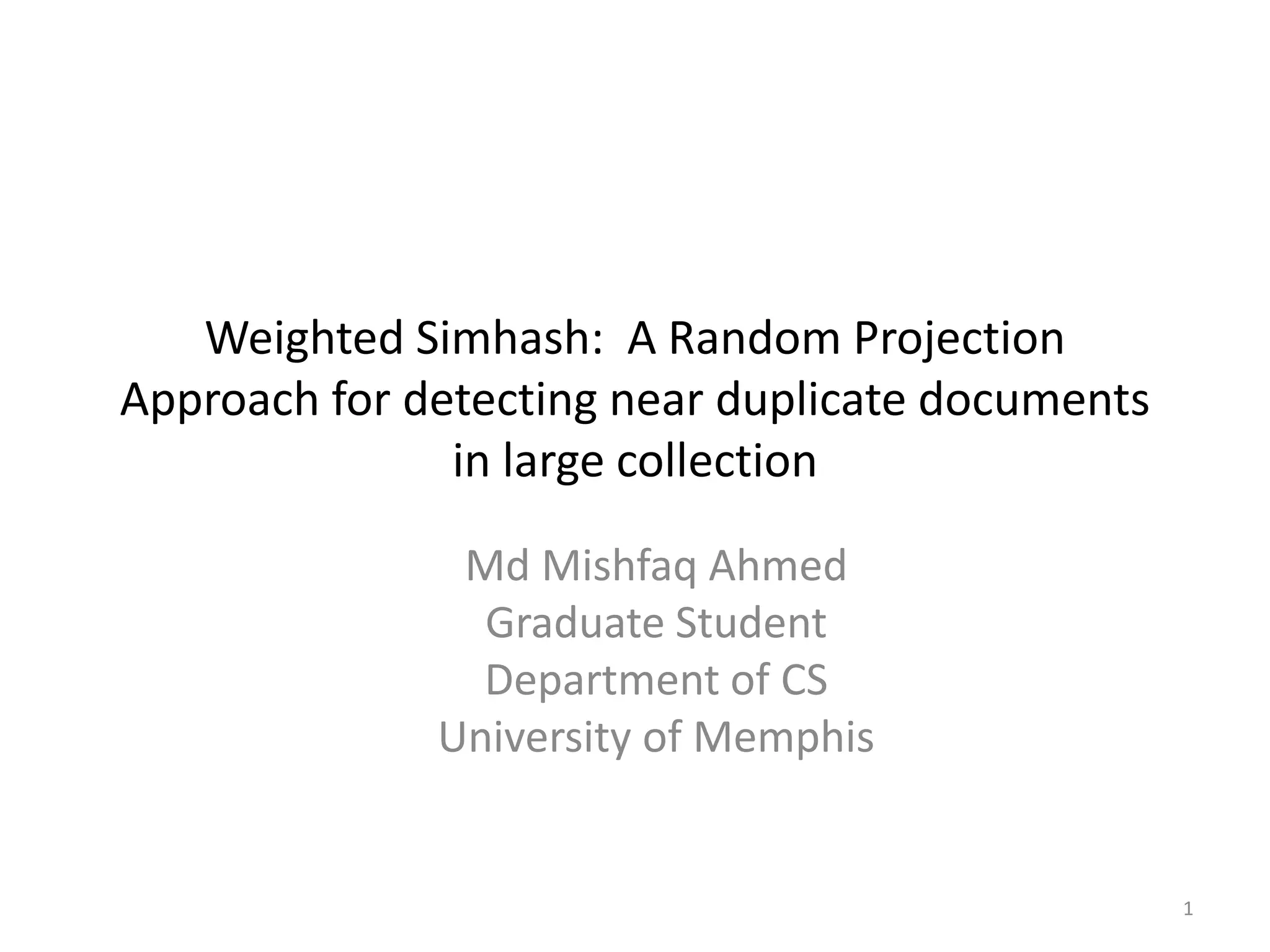 The document presents a method called Weighted Simhash for detecting near duplicate documents, which considers the inverse document frequency (IDF) of terms to improve identification accuracy. It discusses the limitations of previous near-duplicate detection methods and compares Weighted Simhash with traditional approaches like Simhash using experimental results. The findings indicate that while Weighted Simhash achieves better runtime efficiency, its precision and recall performance are comparable to that of Simhash.