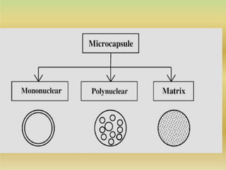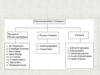 This document discusses microencapsulation, which involves coating solid, liquid, or gas core materials in microscopic capsules. It defines microencapsulation and describes the core and coating materials. Common microencapsulation techniques include air suspension, coacervation, spray drying, pan coating, solvent evaporation, and emulsion methods. The techniques produce microparticles or microcapsules ranging from 1-1000 microns. Microencapsulation offers benefits like masking tastes, sustaining drug release, and protecting unstable core materials.