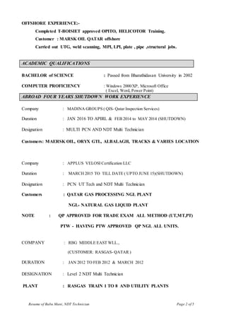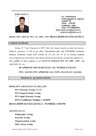 Babu Mani has over 12 years of experience as an NDT technician. He is qualified to perform ultrasonic, magnetic particle, liquid penetrant, radiographic, and eddy current testing. He has worked extensively on oil and gas projects in India and Qatar, performing inspections on equipment like vessels, tanks, heat exchangers, and pipelines. Babu Mani holds numerous certifications including BINDT/PCN for various NDT methods and IRATA level 1 for rope access.
