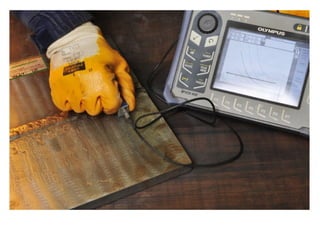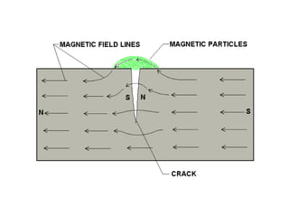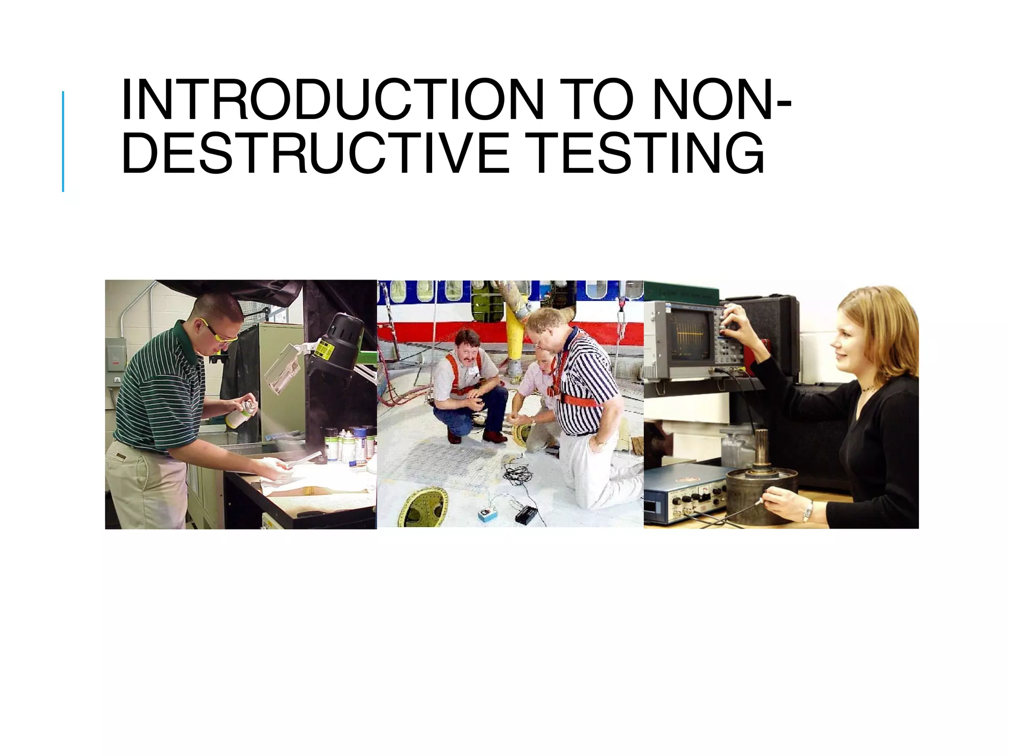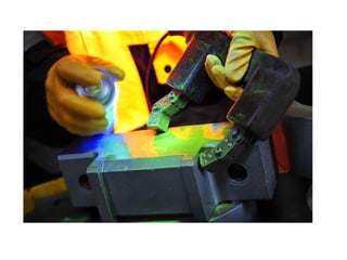 Nondestructive testing (NDT) allows inspection or measurement of materials without causing damage. Common NDT methods include visual testing, liquid penetrant testing, magnetic particle testing, ultrasonic testing, eddy current testing, and radiography. These methods are used to detect inherent, processing, and service defects in raw materials and components, as well as to inspect for in-service damage in applications like aircraft engines, rails, and bridges in order to ensure safety and prevent failures.