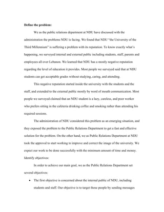 The document outlines a public relations campaign to address NDU's negative reputation regarding the quality of education. The campaign has three main goals: