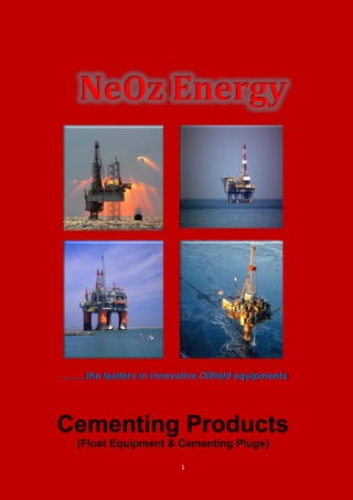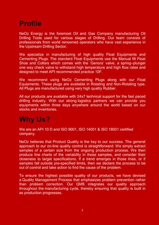 NeOz Energy manufactures oilfield equipment used in various drilling stages, including float equipment, cementing plugs, and other tools. They specialize in high quality products like float shoes, collars, and cementing plugs. NeOz prides itself on its quality control processes and certifications to ISO and API standards to ensure product reliability. They aim to deliver products globally within 48 hours through their wide network of agents and distributors.