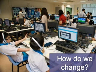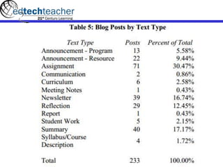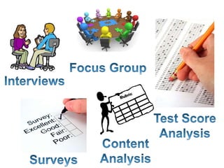 The document discusses using data to assess educational technology initiatives and interventions. It provides a six-step process for conducting research: 1) ask a question, 2) define indicators, 3) identify a sample, 4) identify a method, 5) gather data, and 6) analyze results. Key recommendations include identifying clear learning goals connected to the technology, measuring progress towards those goals using random samples, and using assessment data to improve instruction.
