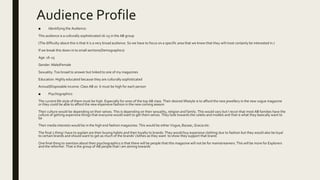 The document provides details for developing an ideal magazine targeted towards a culturally sophisticated 16-25 year old audience from socioeconomic class AB. It outlines the audience profile, proposed genre/subgenre of unisex fashion and music, potential magazine name of "Distinct", representation of models focusing on underrepresented groups, and concept of referencing both mainstream and indie conventions. Content for the first issue would focus on LGBT events, figures, and references. Proposed visual elements include a cover photo with face markings and props representing references, masthead in a distinctive color palette, and contents outlined in circles overlapping a full-body shot with additional props. The second issue aims to discuss discrimination against teens using a different theme and layout each time