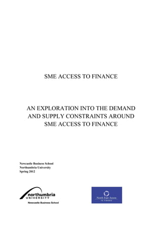 This document summarizes research conducted on SME access to finance in the North East of England. Interviews and surveys were conducted with banks, business angels, and SMEs to understand challenges on both the demand and supply sides of SME financing. Key findings include a more cautious approach to lending from banks post-2008, information asymmetry problems in lending decisions, and insufficient high-quality investment opportunities for business angels in the region. Recommendations focus on improving guidance, support, and flow of opportunities to address financing constraints faced by SMEs.