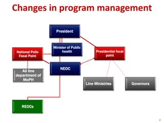 This document outlines Afghanistan's National Emergency Action Plan (NEAP) for polio eradication from 2016-2017. The plan's goal is to stop wild poliovirus transmission in Afghanistan by the end of 2016 with no new cases in 2017. Key strategies include maintaining program neutrality, focusing on high-risk areas, strengthening community engagement, and enhancing accountability. Targets include conducting 10 vaccination campaigns in 2016-2017 and improving surveillance. The plan also discusses improving campaign quality, monitoring, and data collection to enhance polio eradication efforts.