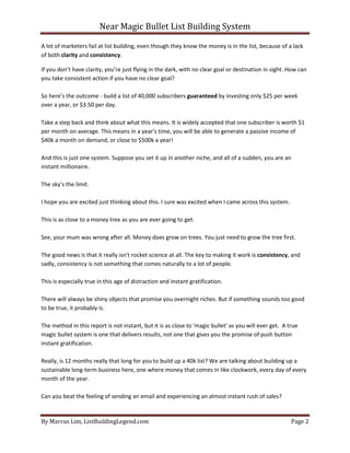 This document outlines a list building system that can generate $250k per year with an investment of only $25 per week using solo ads for traffic. It describes a formula for building a list of 40,000 subscribers over the course of a year through consistent weekly investment. With a list of this size, passive monthly income of around $40k or $500k annually can be achieved. The system focuses on the internet marketing niche and paid traffic from solo ads to quickly and consistently build the list.