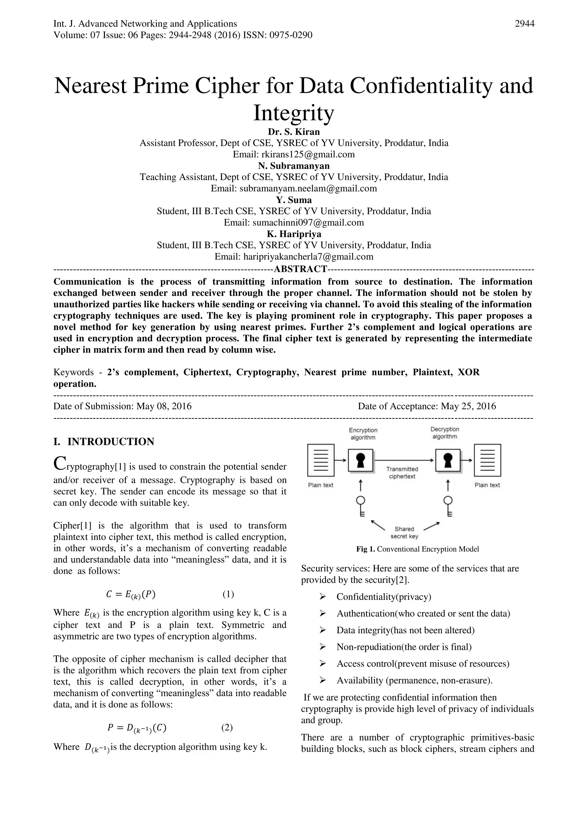 The document presents a novel cryptographic method called the nearest prime cipher, which enhances data confidentiality and integrity through a unique key generation process utilizing nearest prime numbers and logical operations. It outlines both encryption and decryption procedures, highlighting the benefits of the proposed approach, such as the ability to support 256 characters and the use of mixed row and column retrieval for increased security. The conclusion emphasizes the effectiveness of this method in safeguarding data against passive attacks and suggests future enhancements for secure key exchange and improved efficiency.