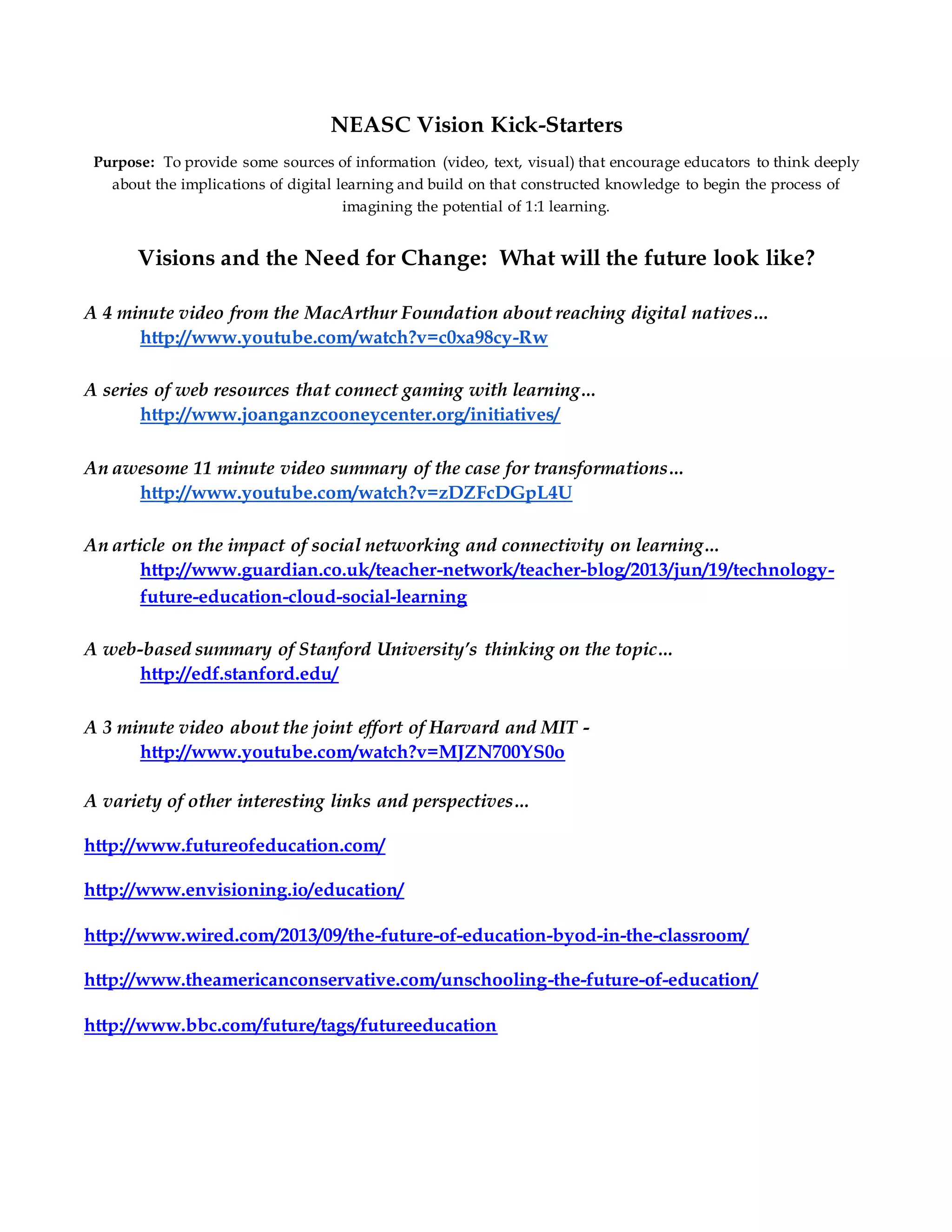 This document provides sources of information to encourage educators to think about the implications of digital learning and building 1:1 learning environments. It includes videos, articles, and websites on visions of the future of education with digital technologies, 21st century skills, and general instructional resources and ideas. Links are provided to resources from organizations like the MacArthur Foundation, Stanford University, MIT, and Khan Academy on topics like social learning, personalized instruction, MOOCs, and flipped classrooms. Educators are also prompted to find their own additional instructional resources online and evaluate them.
