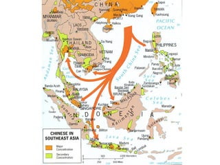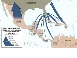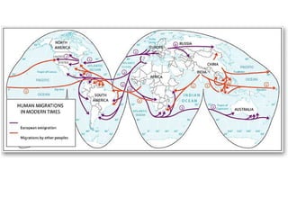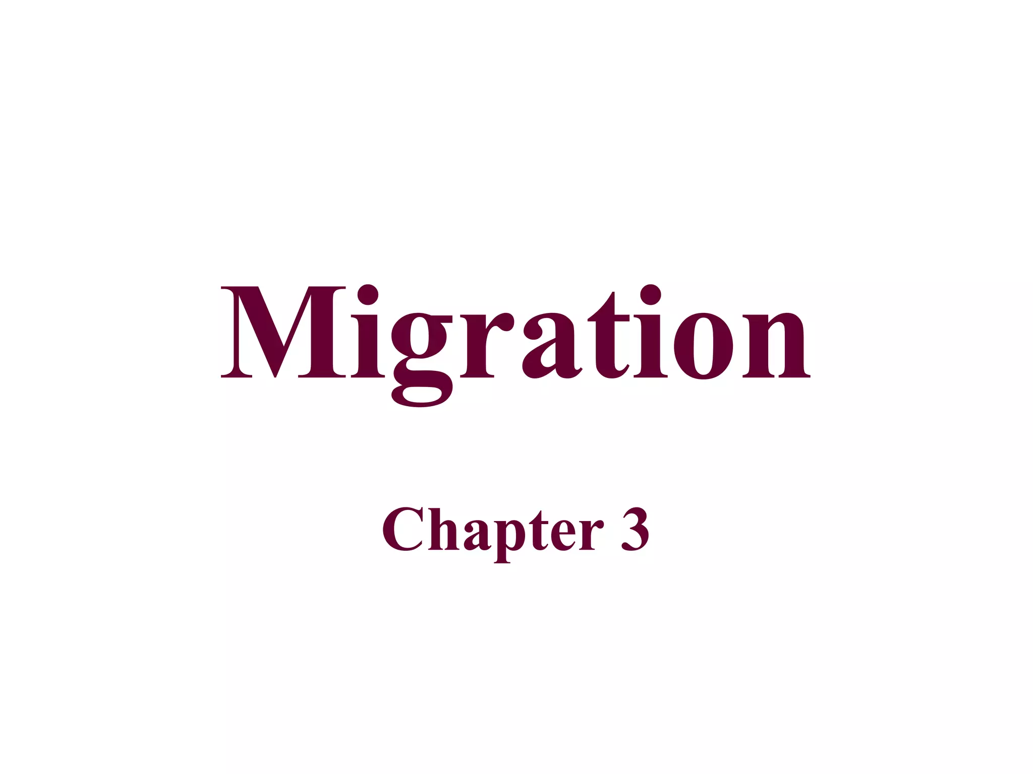Migration can involve both internal movement within a country and international movement between countries. Key factors that influence migration decisions include economic, political, environmental, and cultural conditions in both origin and destination locations. The distance between locations, intervening opportunities, and social networks affect the direction and extent of migratory flows. Forced migration of refugees occurs when people flee their home country due to persecution, conflict, or disaster.