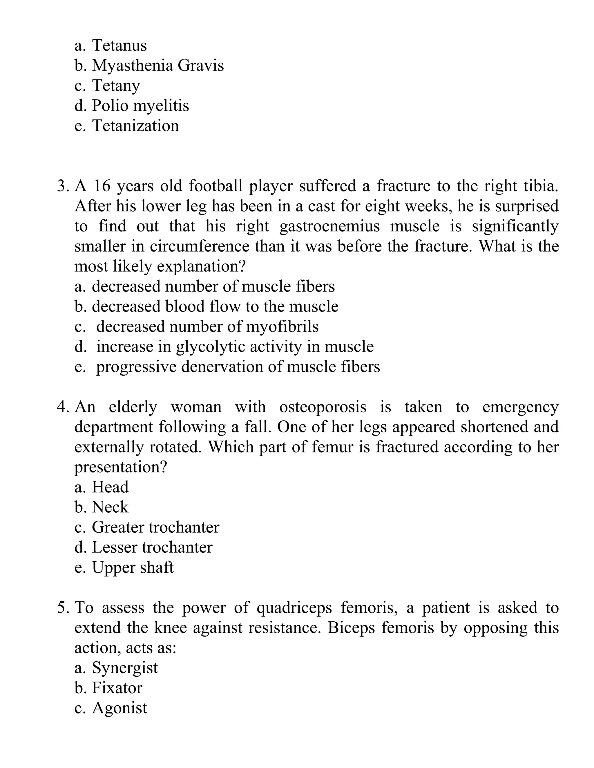 1. A multiple choice quiz assessing knowledge of musculoskeletal and nervous system anatomy and physiology. Questions cover topics like muscle structure, nerve damage presentations, bone fractures, and joint motions.