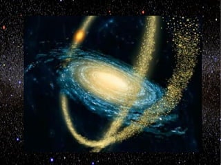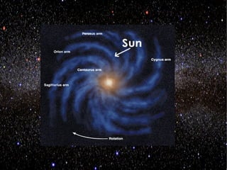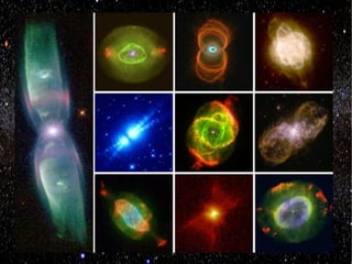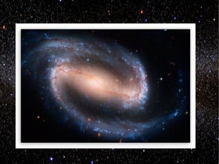 Nebulae are clouds of dust and gas in space. They can form new stars through gravitational clumping. There are different types of nebulae including emission nebulae like planetary nebulae that form during a star's death, and dark nebulae that block out light. Galaxies come in spiral and barred spiral shapes, containing billions of stars. The Milky Way galaxy is a barred spiral galaxy that Earth resides in.