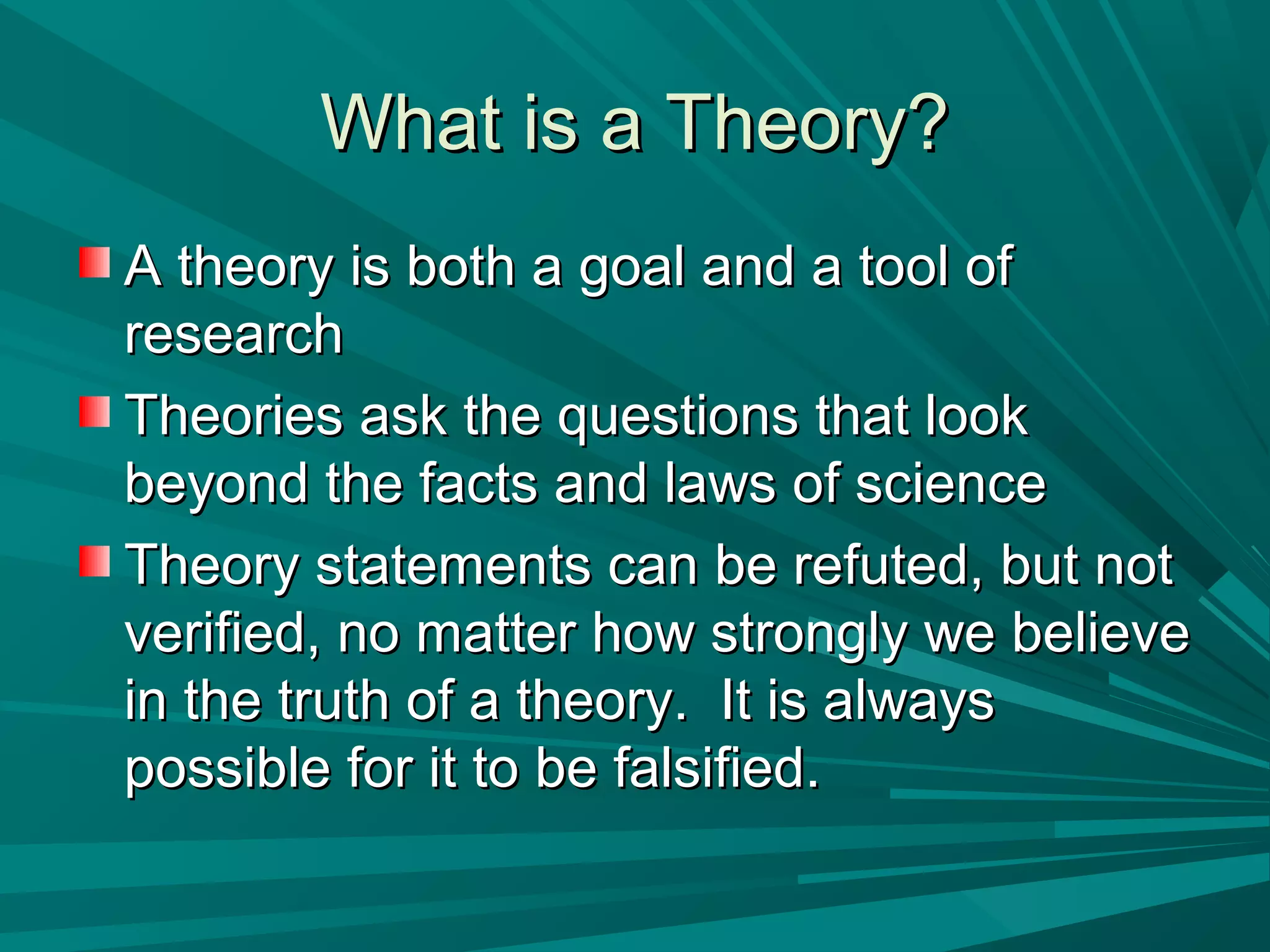 TThheeoorryy?? AA tthheeoorryy iiss bbootthh aa ggooaall aanndd aa ttooooll ooff rreesseeaarrcchh TThheeoorriieess aasskk tthhee qquueessttiioonnss tthhaatt llooookk bbeeyyoonndd tthhee ffaaccttss aanndd llaawwss ooff sscciieennccee TThheeoorryy ssttaatteemmeennttss ccaann bbee rreeffuutteedd,, bbuutt nnoott vveerriiffiieedd,, nnoo mmaatttteerr hhooww ssttrroonnggllyy wwee bbeelliieevvee iinn tthhee ttrruutthh ooff aa tthheeoorryy.. IItt iiss aallwwaayyss ppoossssiibbllee ffoorr iitt ttoo bbee ffaallssiiffiieedd..
