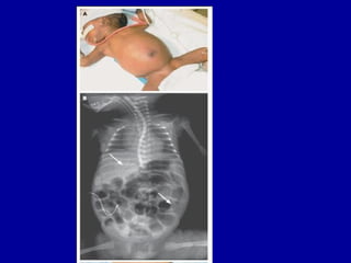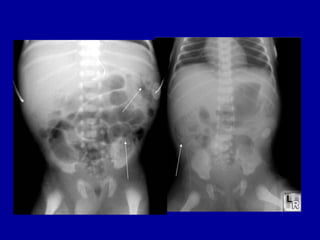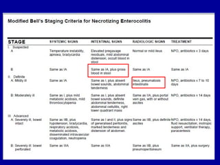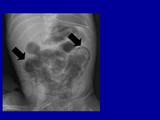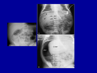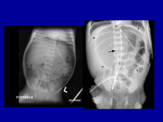 Necrotizing enterocolitis (NEC) is a leading cause of emergency surgery in neonates. It most commonly affects very low birth weight preterm infants. Classic signs on imaging include pneumatosis intestinalis, portal venous gas, and free air indicating perforation. Treatment involves management of sepsis, circulatory support, and may require surgery for advanced cases. Long-term complications are common, affecting 50% of survivors. Early diagnosis through monitoring for feeding intolerance and abdominal distension along with radiographic findings is important for optimal management of this serious gastrointestinal emergency in neonates.