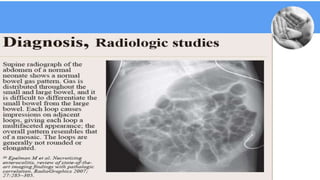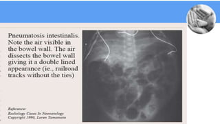 Necrotizing enterocolitis (NEC) is a common gastrointestinal emergency in neonates, especially preterm infants. It involves necrosis of the intestinal mucosa associated with inflammation and infection. Risk factors include prematurity, enteral feeding, and intestinal ischemia. Clinically, NEC presents with abdominal and systemic signs. Diagnosis is based on clinical features and radiographic findings like pneumatosis intestinalis. Treatment involves cessation of feeding, antibiotics, and possible surgery for perforation or failure to improve. Prognosis depends on gestational age and severity of disease. Prevention focuses on exclusive breastfeeding when possible.