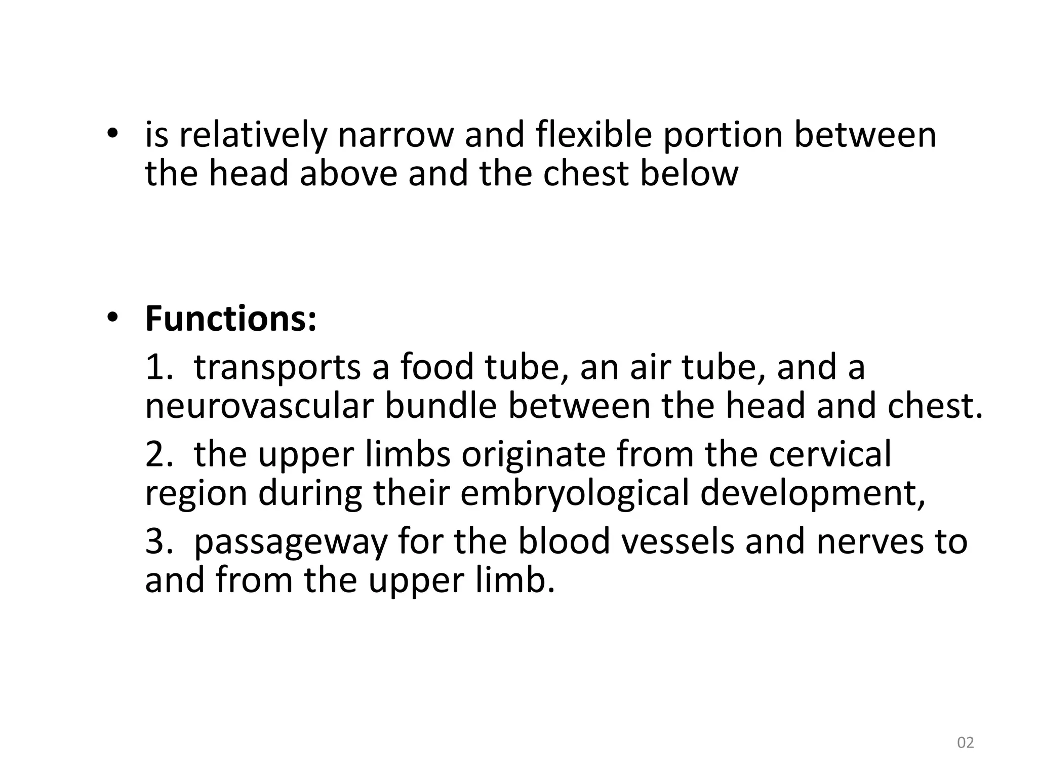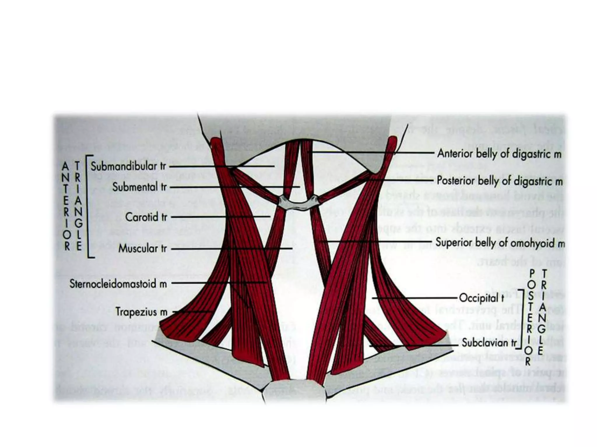 The neck is the region between the head and trunk that contains important structures. It functions to transport the esophagus, trachea, blood vessels, and nerves between the head and chest. The boundaries of the neck include the mandible superiorly, the clavicles inferiorly, and vertebrae posteriorly. The surface anatomy includes palpable structures like the thyroid cartilage. The neck is divided into the anterior and posterior triangles by the sternocleidomastoid muscle. The anterior triangle contains structures like the carotid artery and jugular vein.