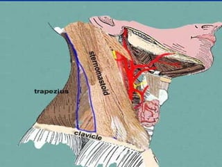 The document discusses the anatomy and triangles of the neck, describing boundaries, contents, and clinical significance. It also covers common neck masses including cysts, sinuses, fistulas, ulcers, tumors, and infections. Lymphatic drainage is described for deep cervical nodes along vertical and circular chains.