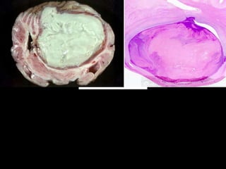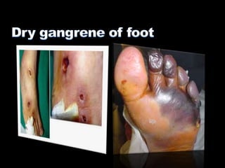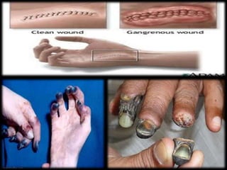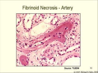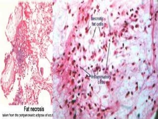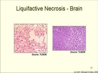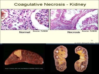 Necrosis begins with cell impairment and loss of homeostasis, leading to cell death. There are several types of necrosis including coagulative, liquefactive, and caseous. Coagulative necrosis preserves cell structure while liquefactive and caseous necrosis involve enzymatic degradation and liquification/softening of tissue. Gangrene involves extensive tissue necrosis complicated by secondary bacterial infection and putrefaction.