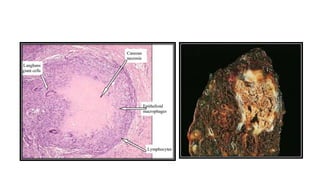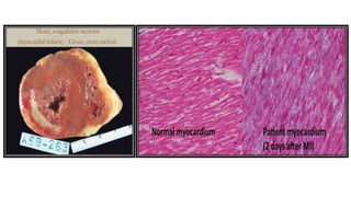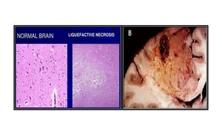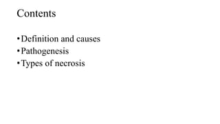 Necrosis is the death of cells and living tissue. It is caused by factors that damage cells such as lack of blood supply, toxins, or infection. There are several types of necrosis including coagulative, liquefactive, and caseous necrosis. Coagulative necrosis occurs when blood flow is cut off, causing cells to die and leave behind outlines. Liquefactive necrosis causes cells to break down into liquid debris, as seen in brain infarcts. Caseous necrosis is seen in tuberculosis and resembles soft cheese. Overall, necrosis involves the irreversible death of cells and tissue.