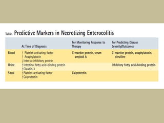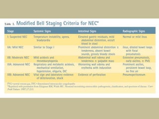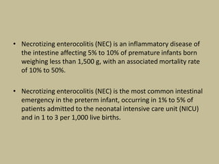 Necrotizing enterocolitis (NEC) is an inflammatory disease of the intestine affecting premature infants. It has a mortality rate of 10-50% and is the most common intestinal emergency in neonatal intensive care units. The disease results from an aberrant immune response of the immature gut to enteral feeding and bacterial colonization. Risk factors include prematurity, type of feeding, and hypoxic events. Clinical signs include abdominal distention and feeding intolerance. Diagnosis involves abdominal x-rays showing pneumatosis intestinalis or free air. Treatment involves bowel rest, antibiotics, and may require surgery for resection of necrotic intestine. Long term outcomes can include strictures, short bowel syndrome, and neurodevelopmental
