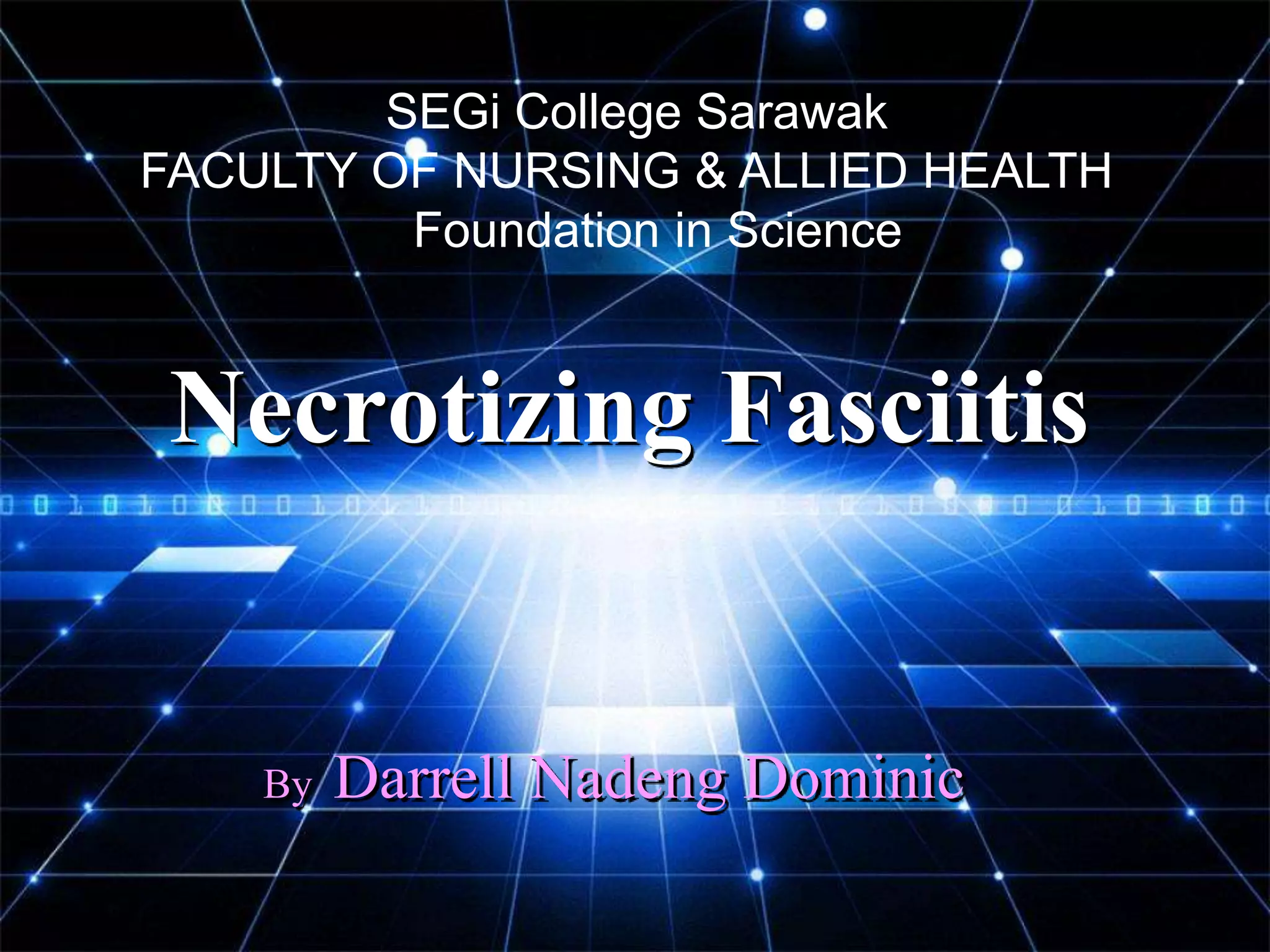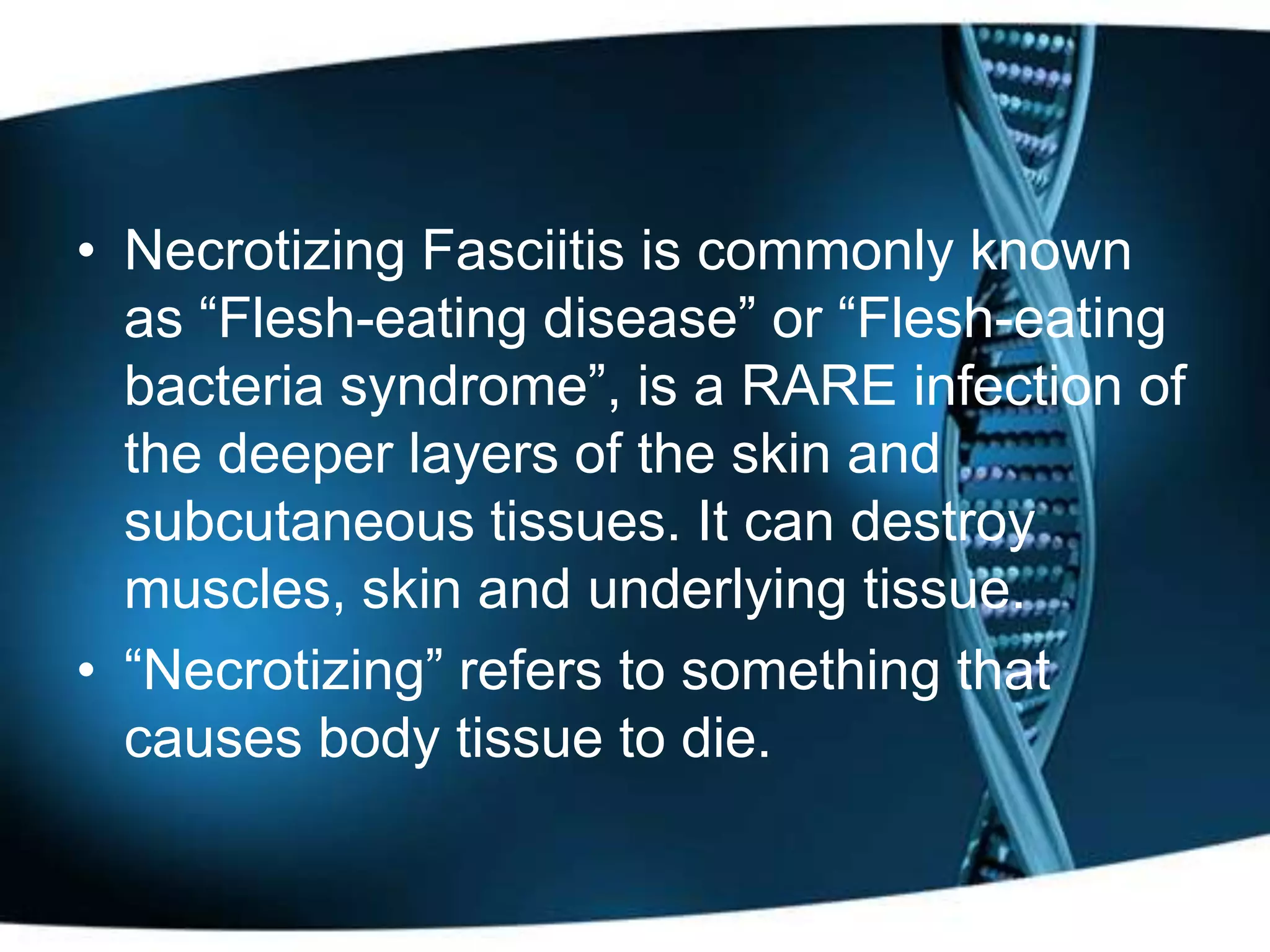 Necrotizing fasciitis, often referred to as 'flesh-eating disease,' is a severe skin infection primarily caused by group A streptococcus bacteria, leading to rapid tissue destruction. Early symptoms include severe pain, redness, and flu-like symptoms, with advanced symptoms resulting in severe complications such as drop in blood pressure and unconsciousness. Immediate treatment involving antibiotics, surgery, and possibly hyperbaric oxygen therapy is crucial to prevent mortality, along with proper wound care and hygiene to prevent infection.