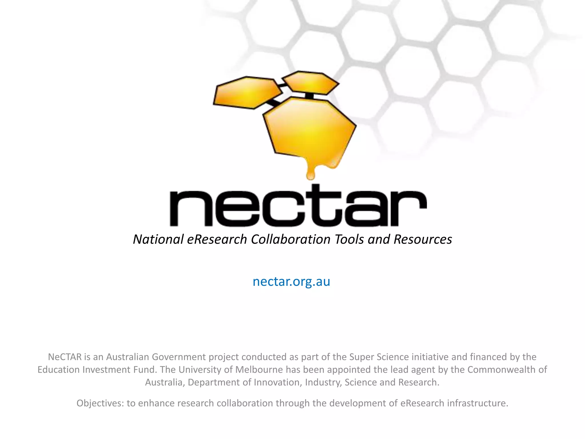 NeCTAR is an Australian government initiative to enhance research collaboration through the development of eResearch infrastructure. The University of Melbourne has been appointed lead agent. Objectives include developing a national cloud computing infrastructure called the NeCTAR Research Cloud using OpenStack. The cloud aims to provide researchers from any discipline with access to computing resources and collaboration tools from multiple sites around Australia.