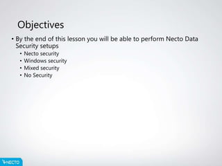 This document provides an overview of Necto data security setup and administration. It discusses the different levels of Necto data security including administration, application, and data levels. It also describes the hierarchy and precedence of security levels, with data security being the highest. An example is given of how data security restrictions would override other security settings for a specific user. The agenda covers Necto data security administration, roles, and custom restrictions that can be applied at the dimension and member levels.