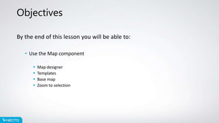 This document provides an overview of the Map component in Necto 16, including how to access and use the Map component, its key properties and functions, and the Map Designer tool. The Map component allows geospatial and hierarchical data to be visualized on base maps and templates for analysis. It is accessed from the Design ribbon and requires at least one geographic dimension. Properties include selecting dimensions, the basemap, template, and zooming functionality. The optional Map Designer further customizes maps.