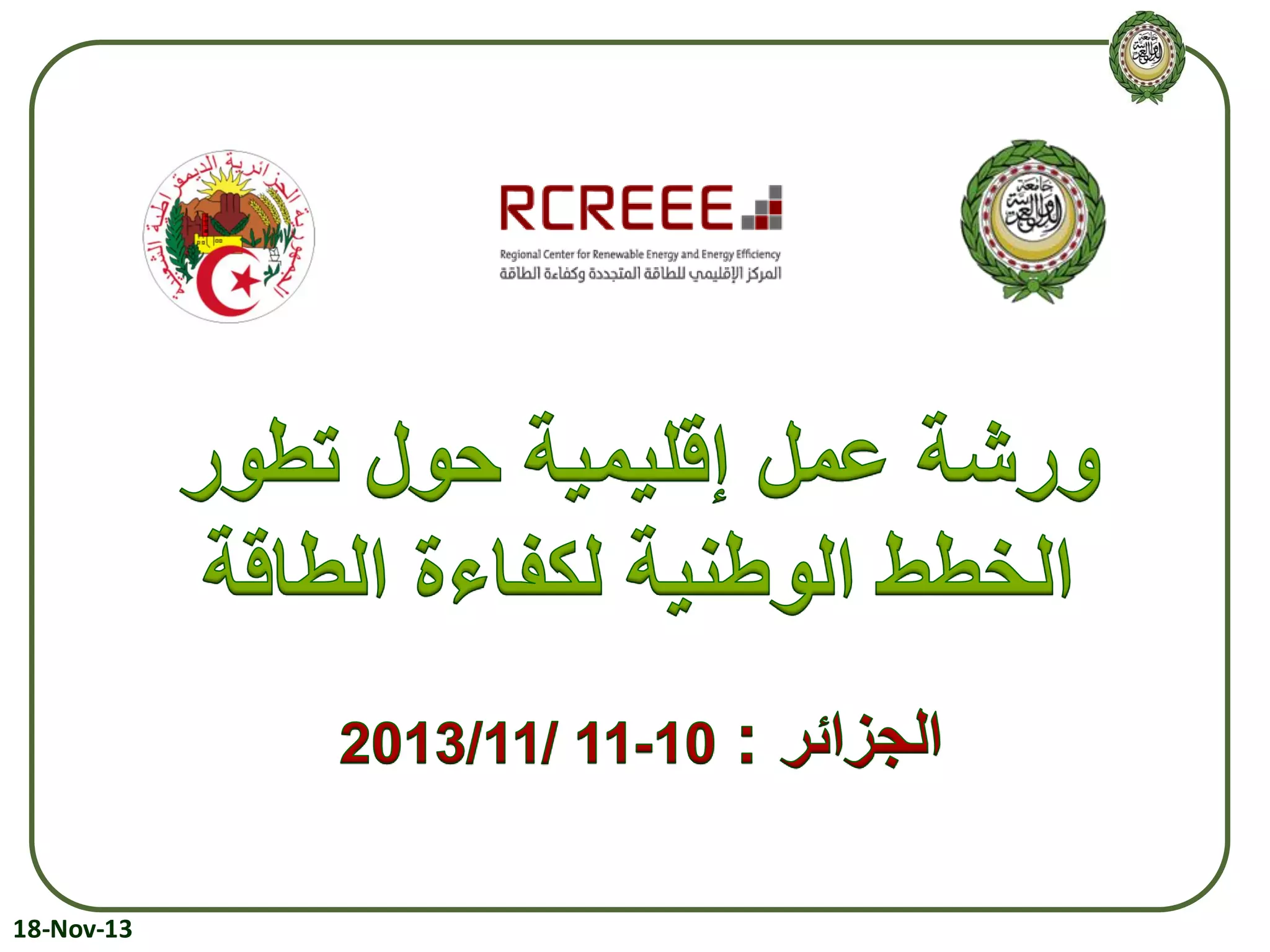 The document presents an overview of energy efficiency and renewable energy in the Arab region, highlighting issues such as high energy import rates, electricity shortages, and significant energy consumption discrepancies among member countries. It discusses the importance of enhancing energy efficiency as a means for sustainable development, job creation, and reduced emissions while urging member states to adopt measures and frameworks to achieve national energy savings by 2020. Additionally, the document outlines various national energy efficiency action plans (NEEAP) and targets for different countries to improve energy management.
