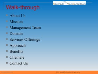 Neechadi TechConsultants is an executive recruiting firm founded in 2010 by engineers with over 12 years of experience. The firm focuses on full-time and contract recruiting across various technical domains including IT, engineering, telecom and finance. Neechadi follows a 4S process of search, study, select and submit to source qualified candidates for clients and also offers contract staffing solutions. The firm has successfully placed candidates with companies in India and aims to expand its client and candidate networks.