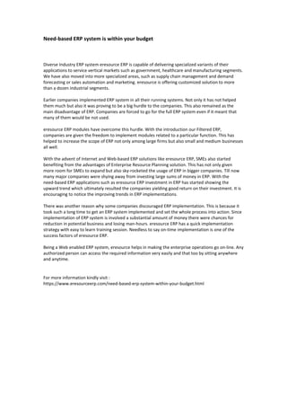Eresource ERP offers a need-based ERP system that caters to various industries, promoting specialized solutions in sectors like government, healthcare, and manufacturing. It allows companies to implement only the necessary modules, facilitating broader adoption among both small and medium enterprises as well as larger firms. The system features quick implementation and web-based access, addressing previous hurdles associated with traditional ERP investments.