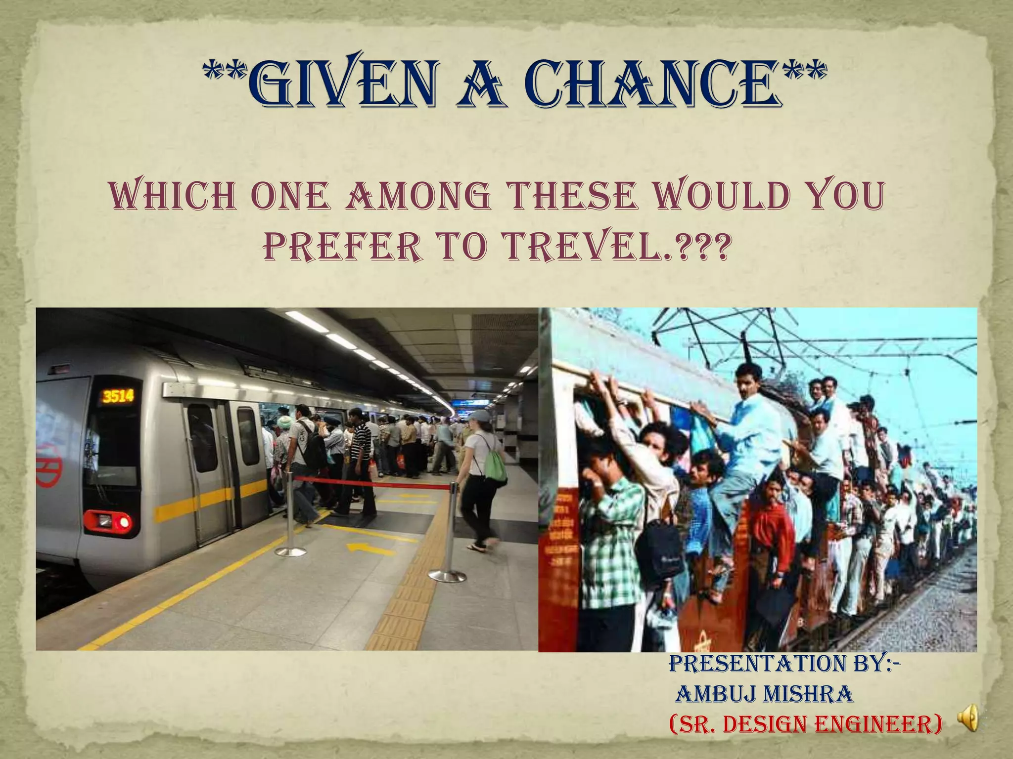 The document discusses urbanization trends in India and the need for improved public transportation systems in cities. Some key points: - By 2030, over 40% of India's population is expected to live in urban areas, up from about 28% currently. However, many urban dwellers live in slums with poor conditions. - Urban areas account for over 50% of India's GDP, so cities play a major economic role. But transportation access is still limited, with only 42% of trips using public transit in Lucknow. - Developing efficient, reliable public transportation like metro rail, BRTS, and monorail systems is important to support urban growth and provide a higher quality of life for city