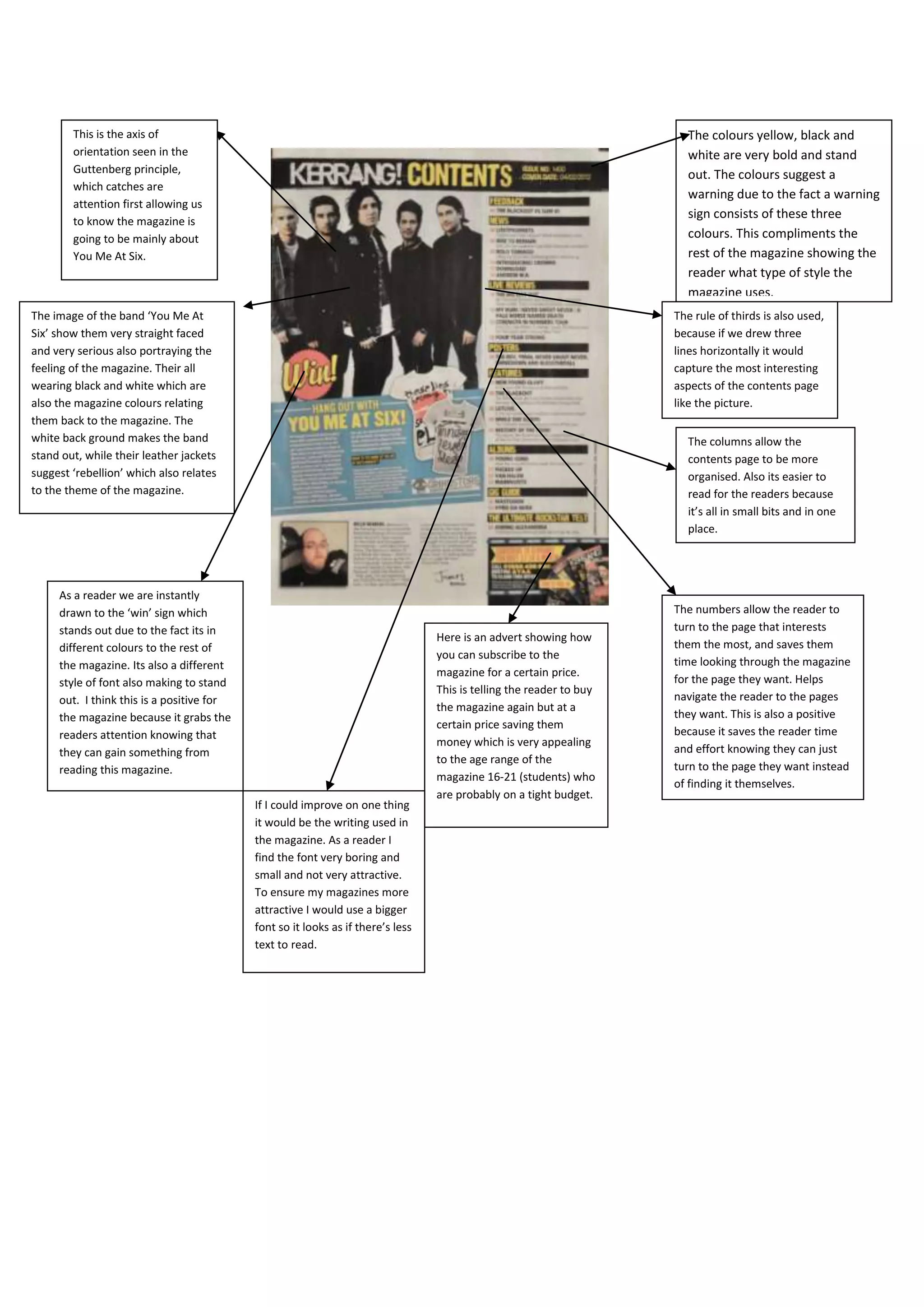 The document summarizes and compares the contents pages of two music magazines, Kerrang and Uncut. It analyzes design elements like layout, colors, images and fonts used to understand the magazines' styles and target audiences. Key highlights include Kerrang using bold colors and images of an angsty band to appeal to younger readers, while Uncut features classical guitar and open landscape photos, signaling a focus on classic rock for an older demographic. Both magazines effectively use columns and page numbers to organize content and aid navigation.