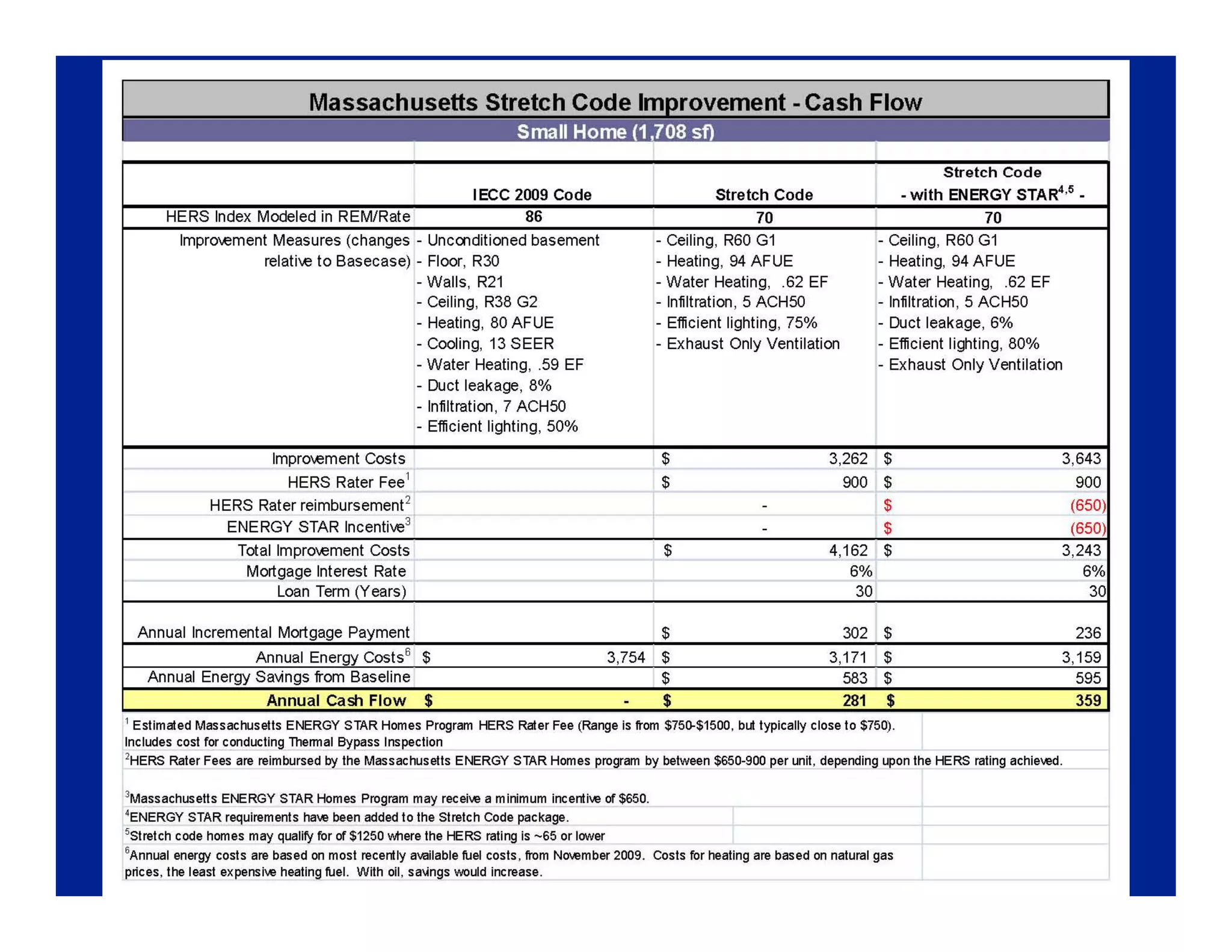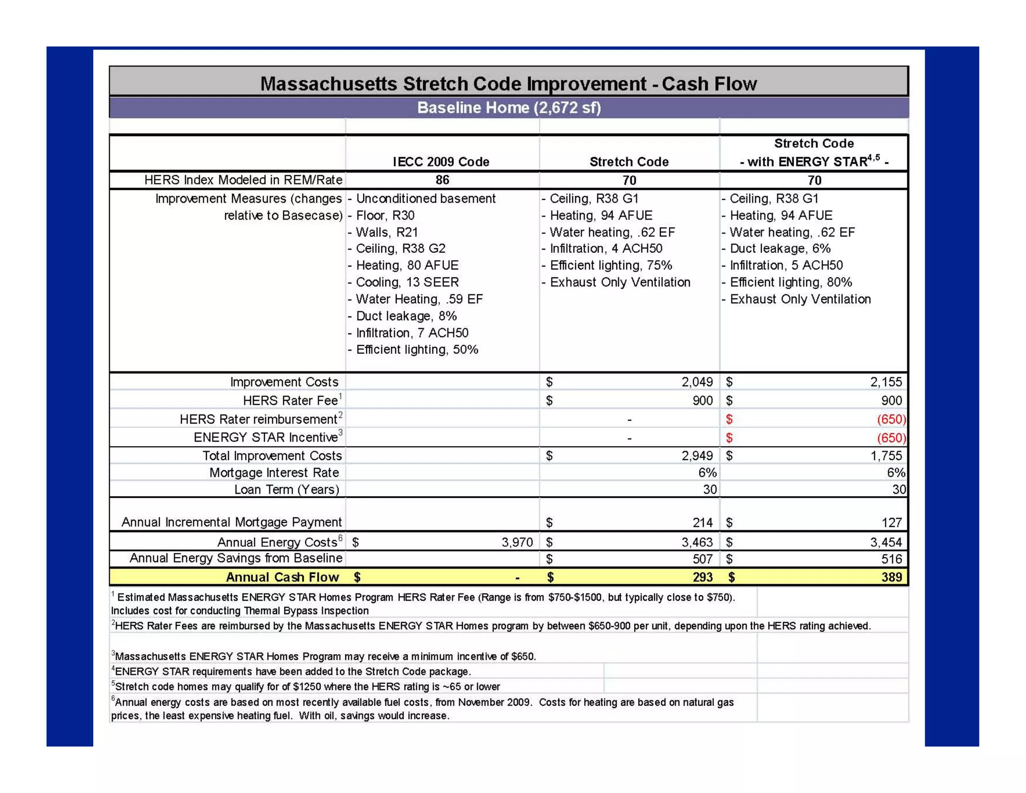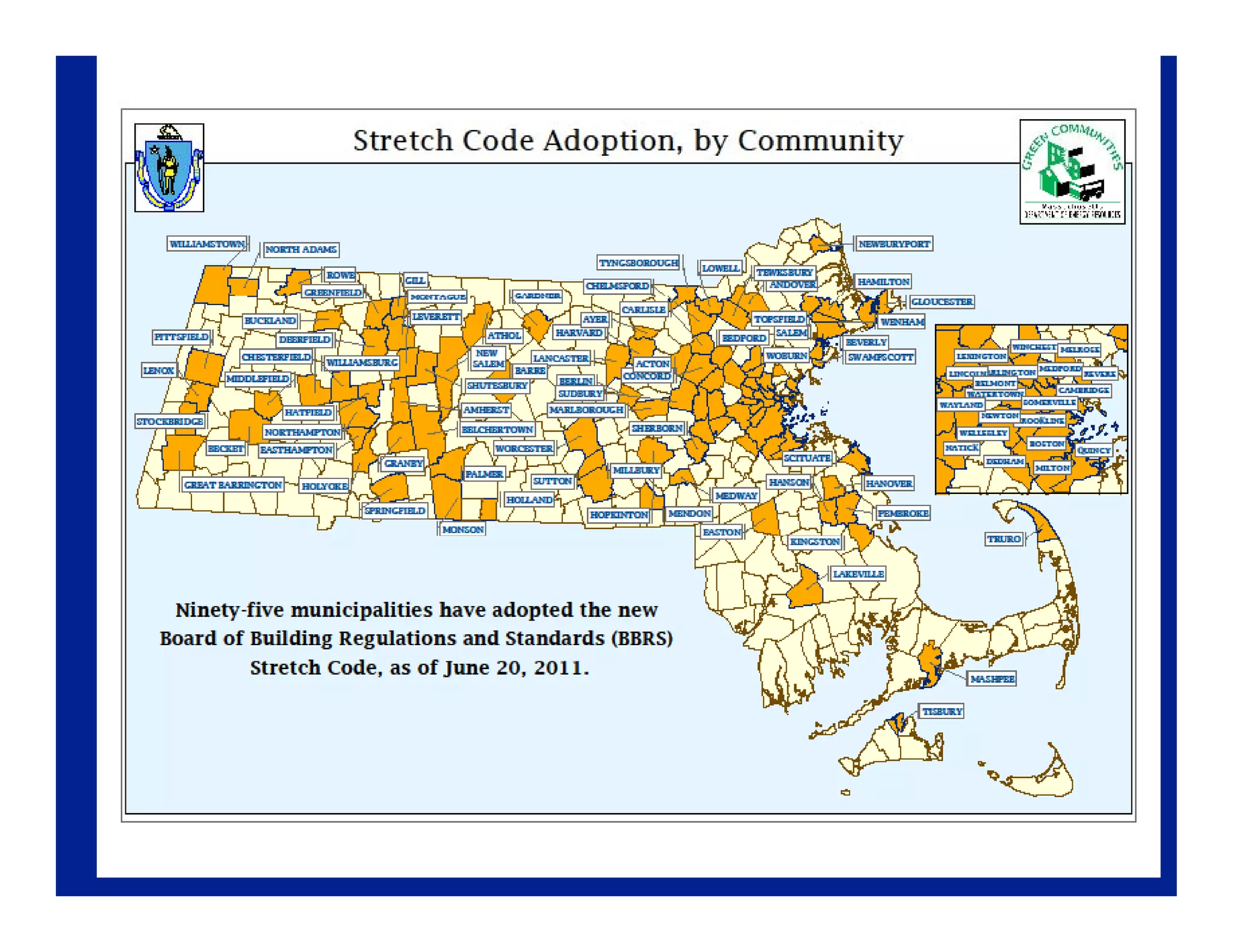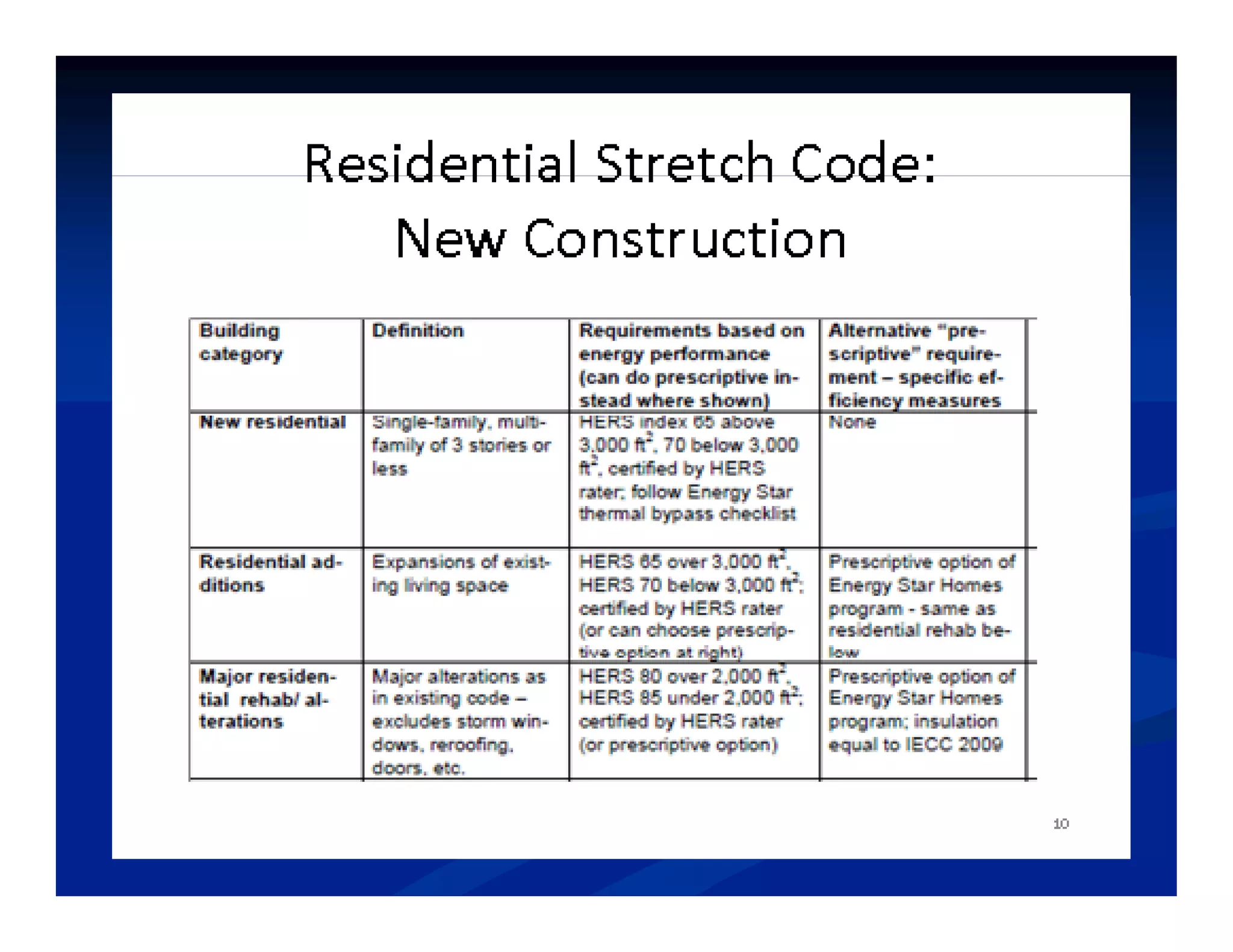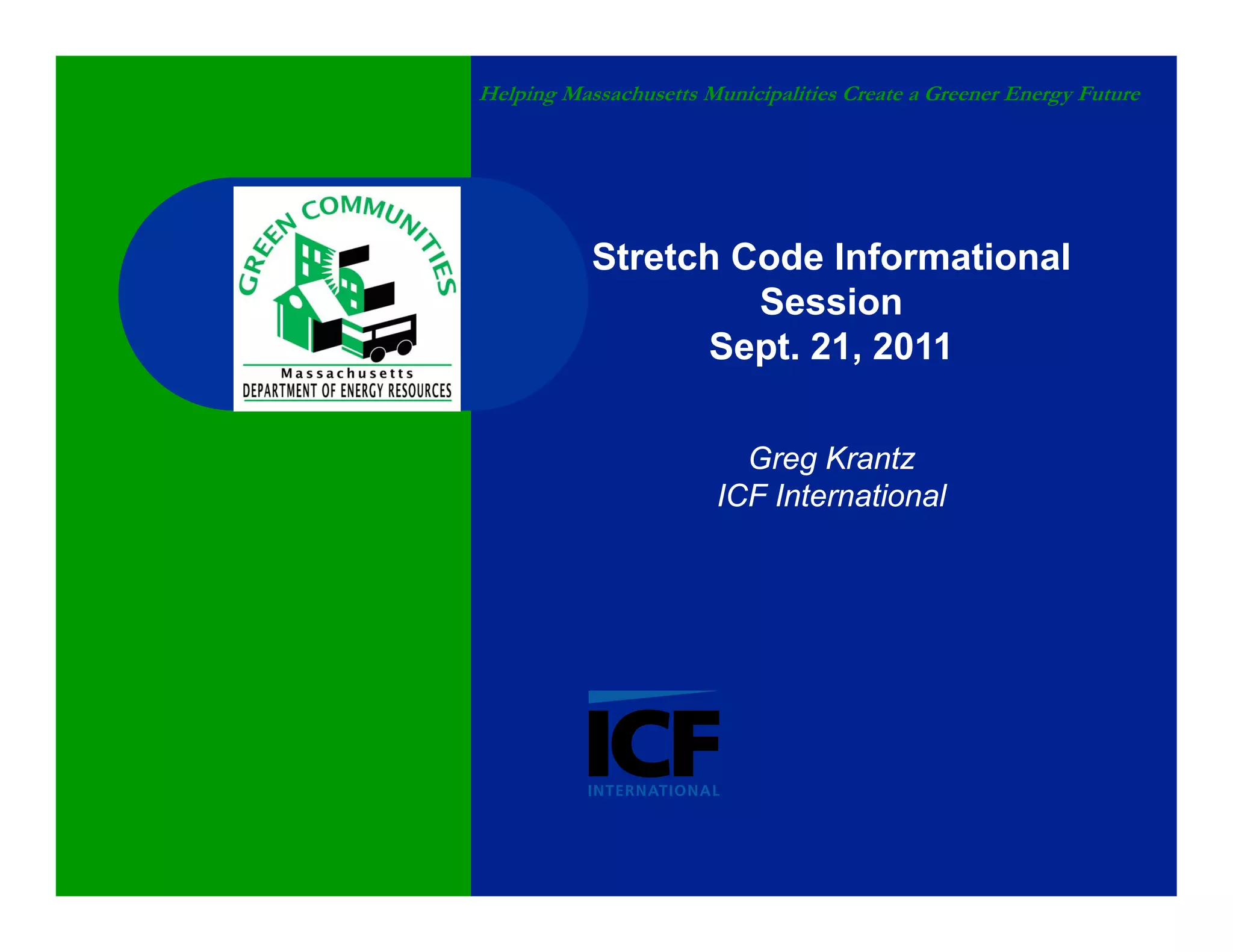 This document provides an overview of Massachusetts' Stretch Energy Code and how it aims to help municipalities create a greener energy future. The Stretch Code is an optional appendix to the base energy code that is approximately 15-20% more stringent. It covers new construction, additions, and renovations of both residential and small commercial buildings. Compliance can be shown through either a performance path using tools like the Home Energy Rating System, or a prescriptive path with requirements for things like window efficiency and duct sealing. Training is provided to help builders and code officials understand and implement the new standards.