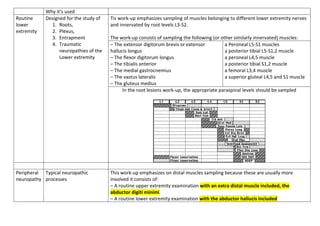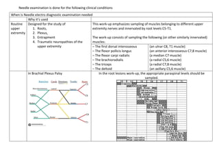 This document discusses different types of needle electromyography (EMG) examinations and their purposes. A routine upper extremity examination samples specific muscles innervated by cervical and thoracic nerve roots to study roots, plexuses, entrapments and traumatic neuropathies. A routine lower extremity exam similarly samples leg muscles. Peripheral neuropathy exams emphasize distal muscles. Anterior horn cell disease exams sample widespread muscles to rule out multiple radiculopathies. Myopathy exams focus on proximal muscles. Exams for neuromuscular transmission defects previously used repetitive nerve stimulation but now rely more on single fiber EMG for its greater sensitivity in detecting jitter, which represents variability in neuromuscular transmission.