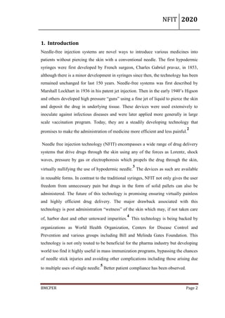 This document discusses needle-free injection technology (NFIT) as an alternative to traditional hypodermic needle injections. It begins with an overview of the history and development of NFIT, noting that the first air-powered needle-free systems were developed in the 1940s-1950s. The document then describes the key components and principles of NFIT, including that it uses forces like pressure, shock waves, or electrophoresis to propel medication through the skin without a needle. It discusses the structure of human skin and how NFIT administers drugs underneath the skin. The document outlines advantages of NFIT like less pain, avoidance of needle phobia, and benefits for mass immunization programs. It also notes some limitations, such