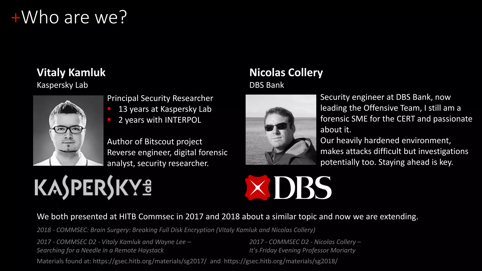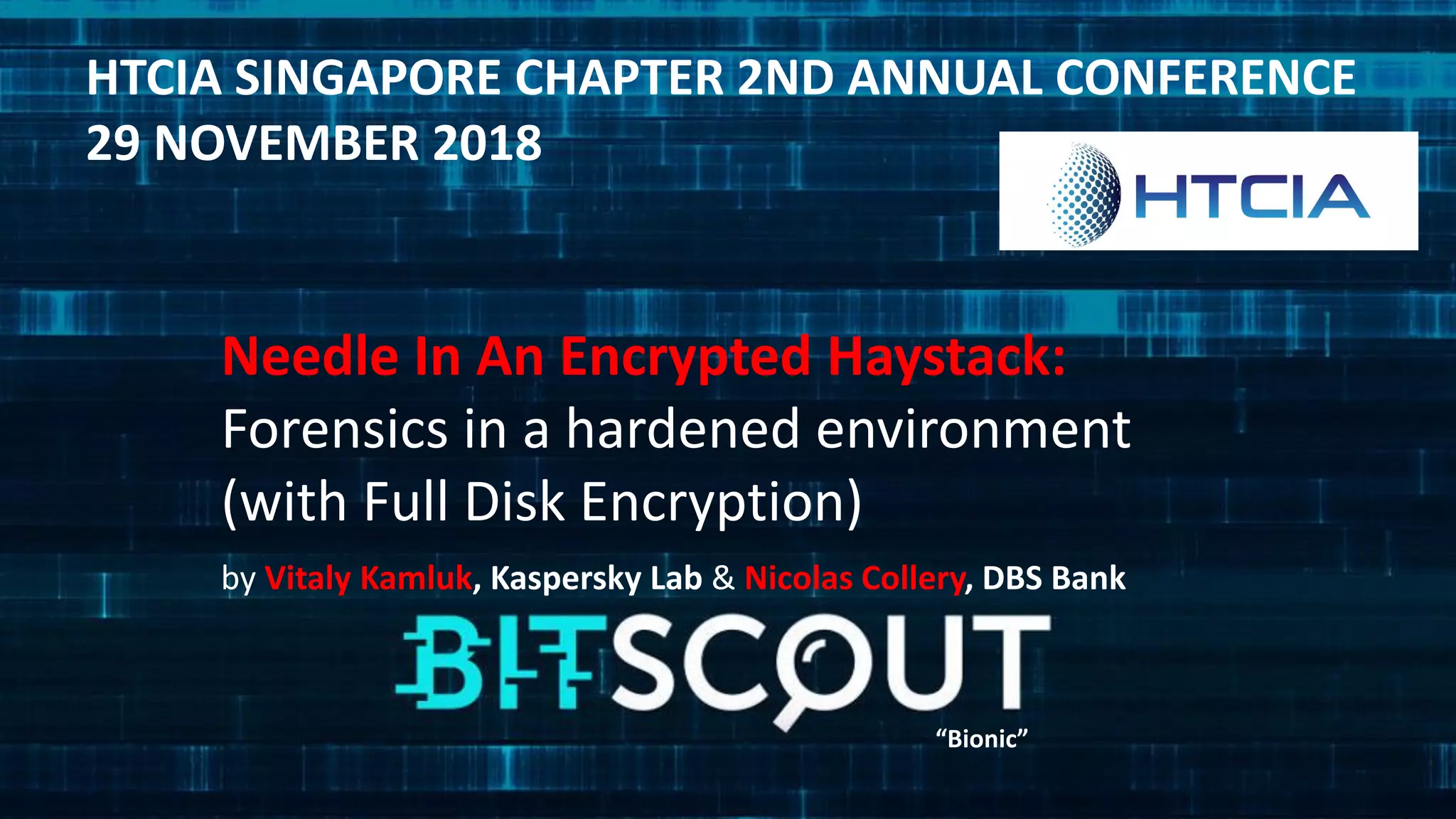 The document discusses forensic investigations of encrypted disks using Bitscout, an open-source live forensics operating system. It describes three demos of analyzing full disk encryption on Windows 10: 1) interactively analyzing a locked live Windows system through virtualization; 2) accessing a legacy MBR-encrypted disk through a FUSE driver; and 3) entering UEFI to load an encryption driver and export the decrypted disk over the network. The document concludes with information about remote forensics training offered in Singapore that will cover related topics like malware discovery, disk encryption, and converting hosts into honeypots.