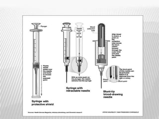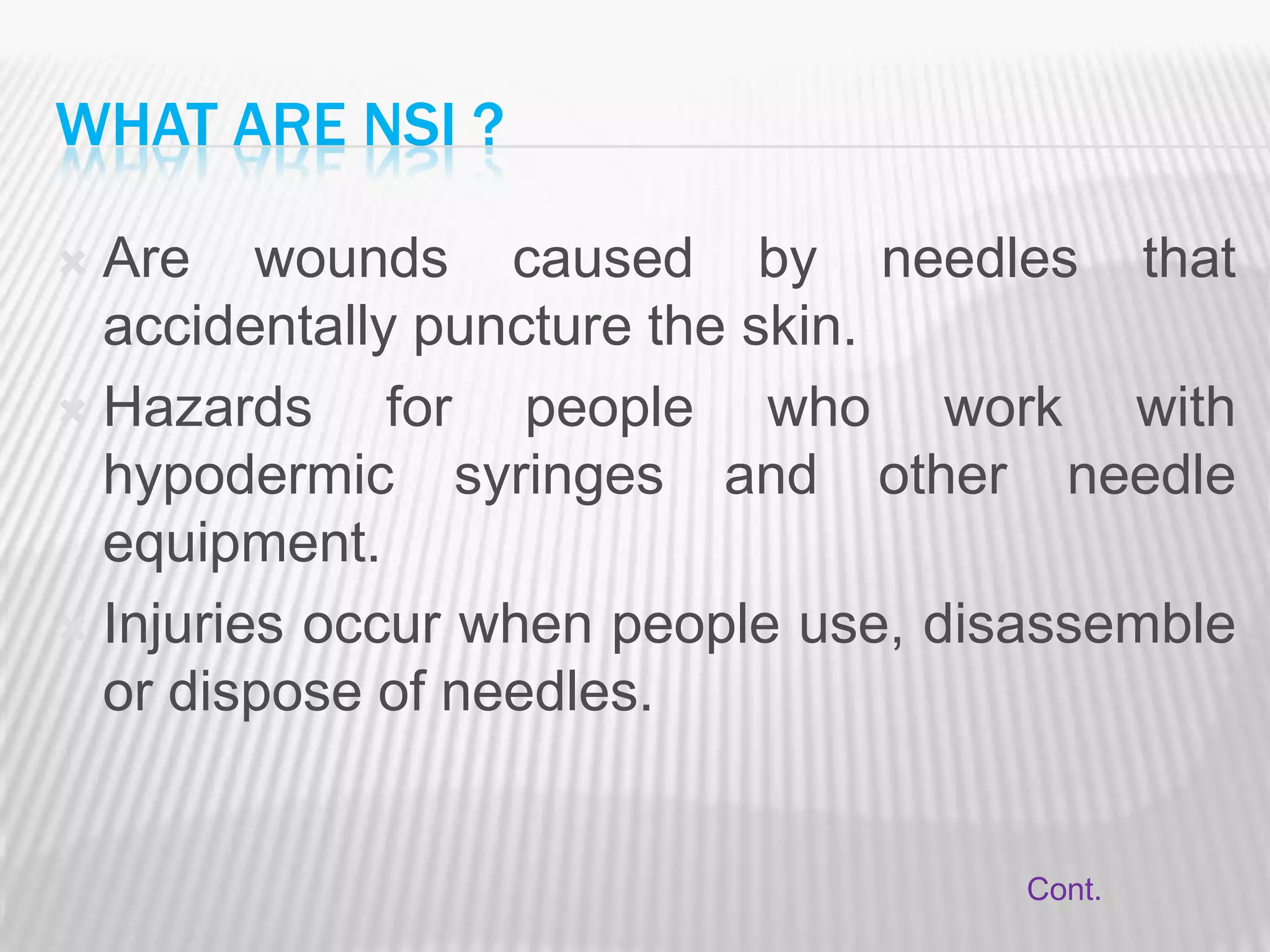 This document discusses needle stick and sharp injuries (NSI). NSI occur when needles accidentally puncture the skin, often when healthcare workers are using, disassembling, or disposing of needles. Improper disposal of needles also poses a risk. NSI can transmit bloodborne pathogens like hepatitis B, hepatitis C, and HIV. Despite training programs, NSI remain a problem. Nurses and other clinical staff are most at risk. Injuries often occur during disposal or manipulation of needles in patients. Proper handling and disposal of sharps can help prevent these injuries.