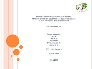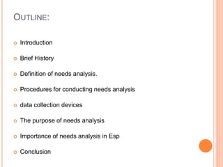 This document outlines the importance of needs analysis in ESP (English for Specific Purposes) course design. It begins with a brief history of needs analysis in language teaching, noting its emergence in the 1970s. It then defines needs analysis and target needs versus learning needs. Several procedures for conducting needs analysis are described, including various data collection devices like questionnaires, interviews, and observations. The purpose of needs analysis in language teaching is to identify students' language needs to design effective courses. For ESP specifically, needs analysis is crucial because courses must teach the English skills students require for their fields. Conducting needs analysis ensures ESP courses are tailored to meet students' particular professional needs.