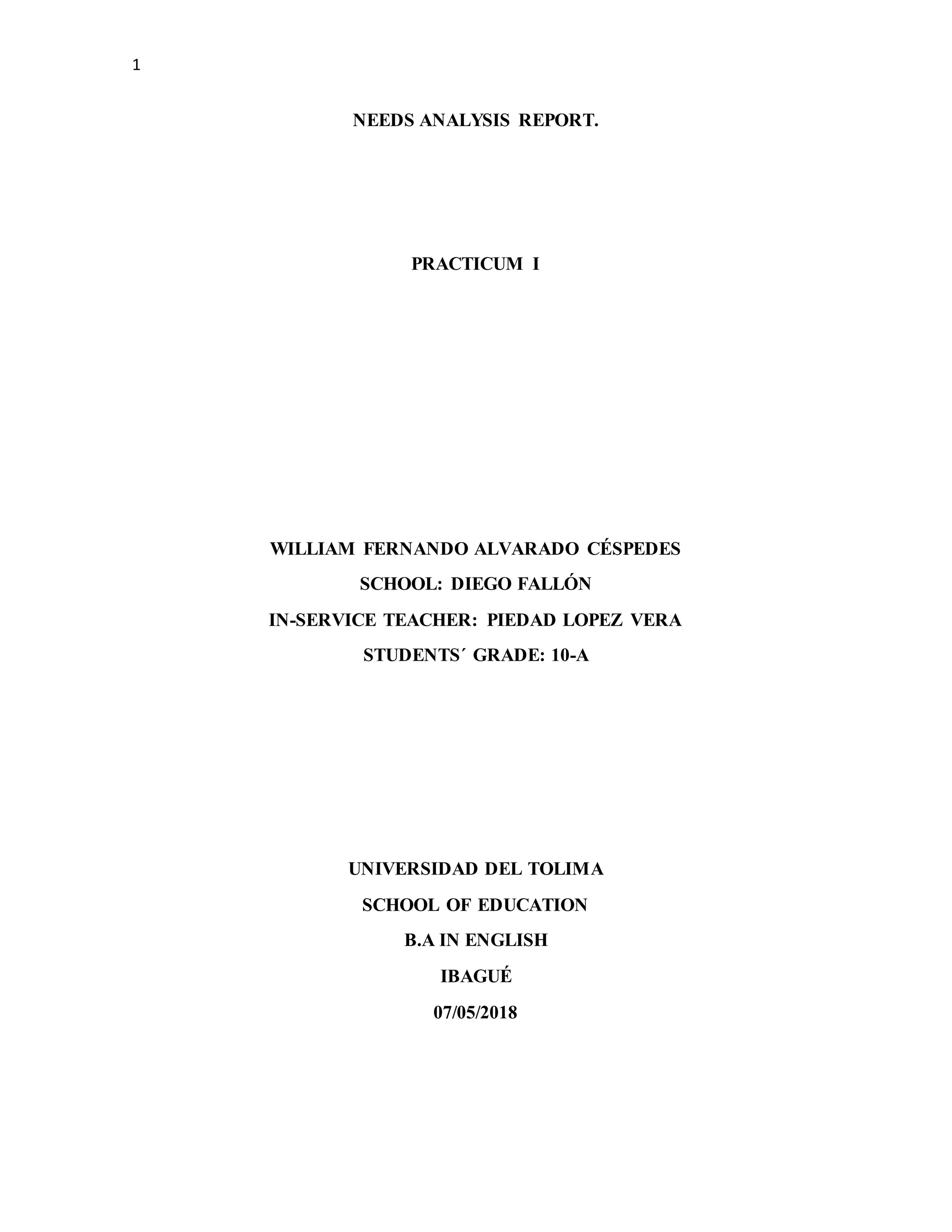 The needs analysis report summarizes data collected from a questionnaire given to 32 tenth grade students studying English at a school in Ibagué, Colombia. The data provides insight into students' preferred ways of learning English, interests, experiences with English outside of school, participation in class, and opinions. Key findings include that most students prefer learning through audio and music, feel motivated in English class but some feel anxious, and think their opinions should be considered in developing English classes.